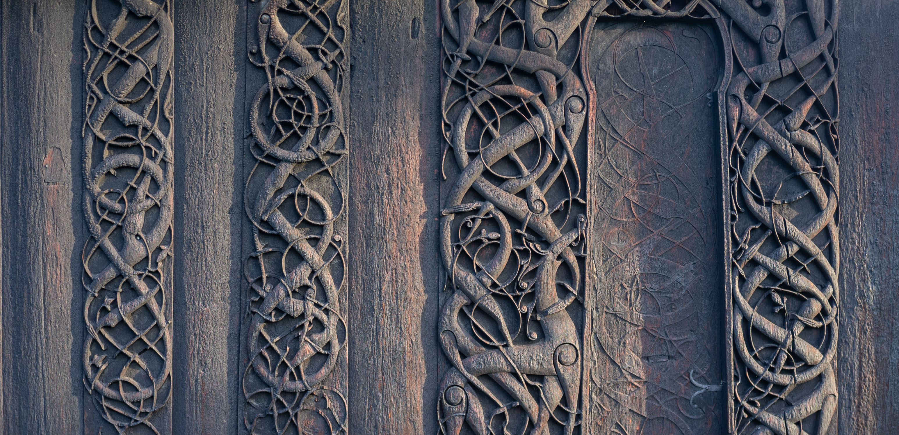 (fornote: for ordens skyld – i dette innlegget, som i det meste jeg skriver om portalen, er ornamentet omtalt med retninger som om portalen ligger flatt – på høvelbenken om du vil. Dette handler både om at det er den orienteringa vi jobber med portaldelene gjennom skjæreprosessen, men også om at det gir et lettvint og ryddig referansesystem. Det er også verdt å nevne at dette innlegget primært er basert på venstre portalplanke. De overordnede prinsippene bør være gyldige for hele portalen, men noen detaljer er lokale til denne delen.)