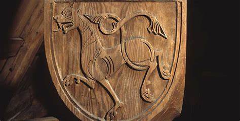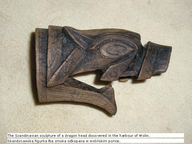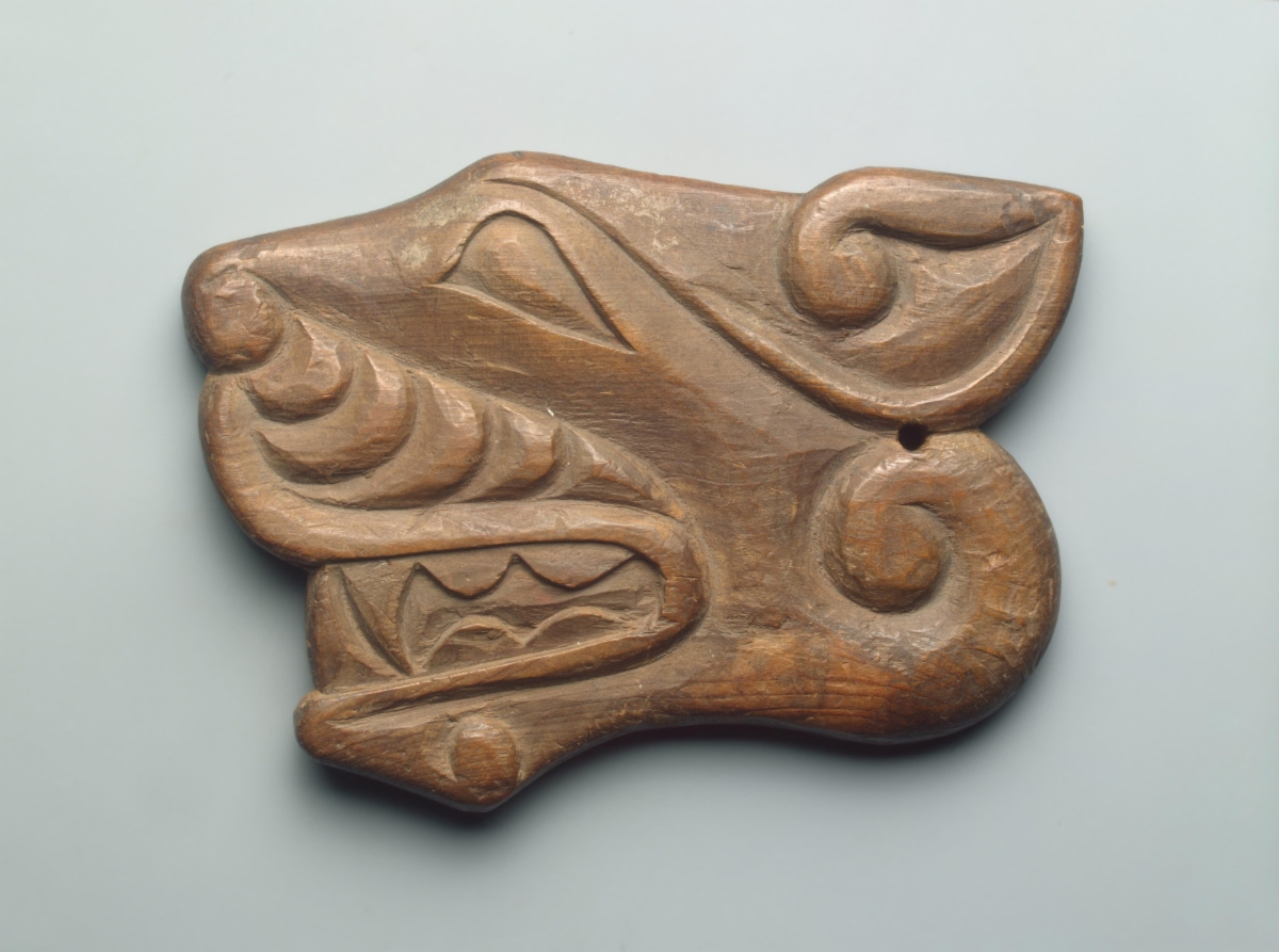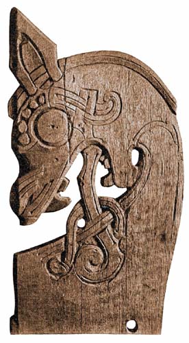 "Dyrehode i tre fra 900-tallet, i jellingestil. Framover spissende øye, og neseslynge."