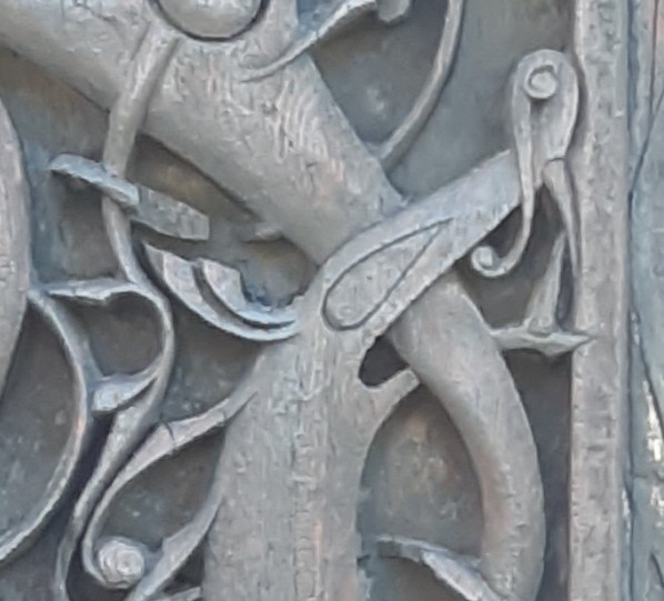 There are no concave areas on the Urnes portal, only convex bodyparts bulging, and empty space between them. And the braiding is consistent. Over under over under… With only a few exceptions, for example when two toes og in different directions.