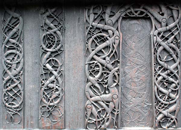English: The knife egde shaping of the lines make them appear as without spatiallity, and only there to direct the play between light and shadows. This play of illumination must have been formidable when the portal was facing west. Now it is situated on the north wall, but in late summer evenings the spectacle is still to be seen. So the large scale and the properties og the pinewood lays the ground for the Urnes style shine here more than any other place.