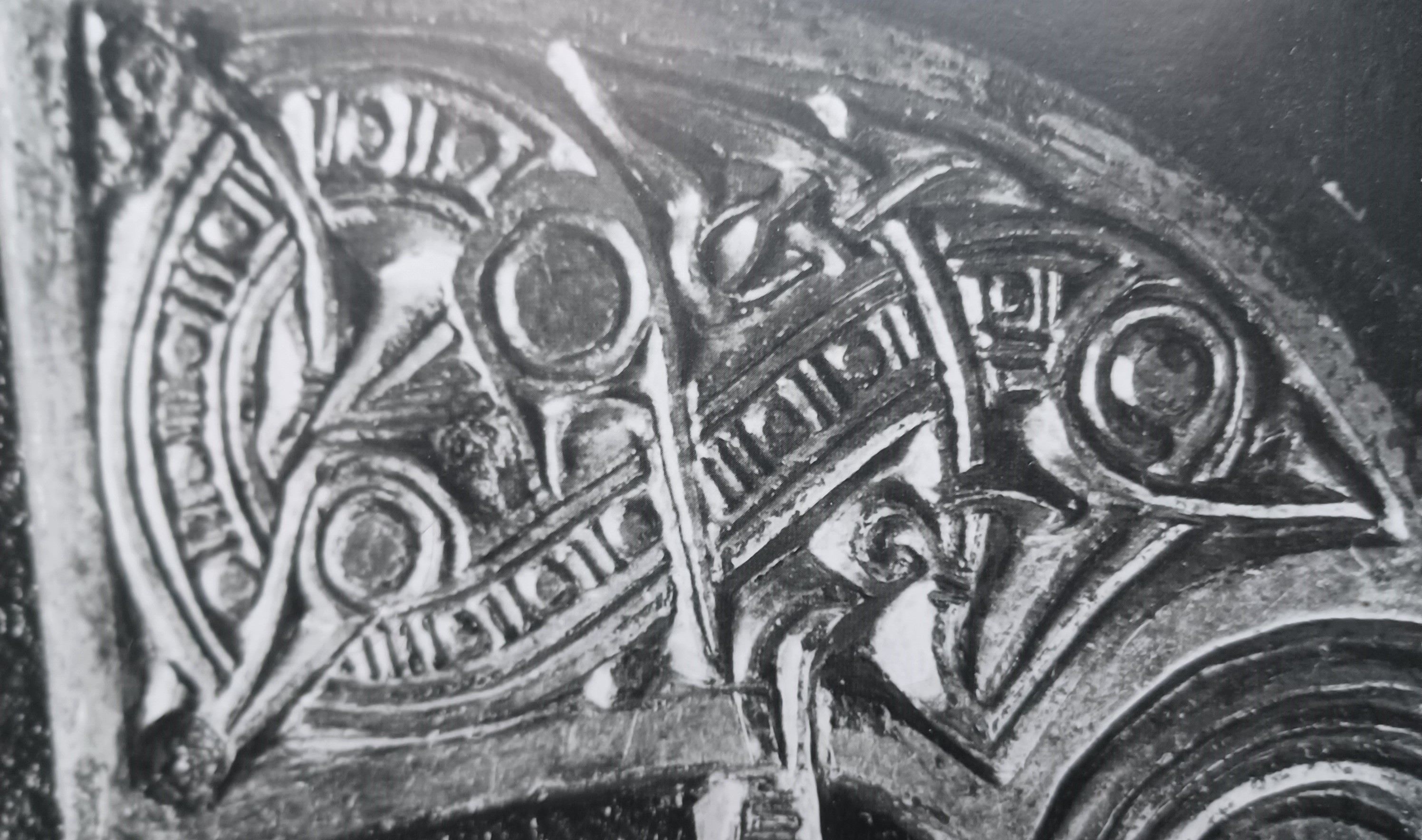 The snout tendril elegantly throws itself backwards over the nostrils. Excactly when this feature shows up for the first time in the history of ornaments, I dare not say, but it is frequently seen already in the 9 th century.