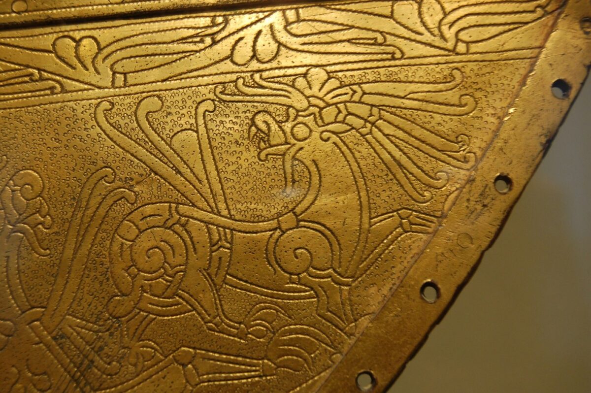 English: Almost spiral shaped joints on a merovingian harness mount from Valsgärde, Sweden.