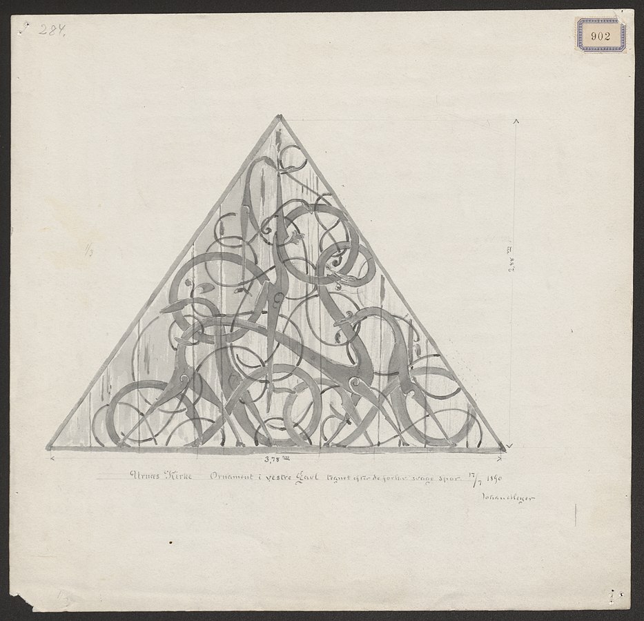 English: The vikings had no clue they were living in the viking age, and the artisans did not know they were working in the Urnes style. These are modern terms invented to easier explain and describe history. The carvings on the exterior of Urnes stace church are reused elements from an older church, and has lend its name to the style. Either its Swedish runestones in question, or jewellry and weapons, or whatever objects executed in this style, its all called Urnes style. Named thus, by the archeologist Håkon Schetelig in the early 20th century.