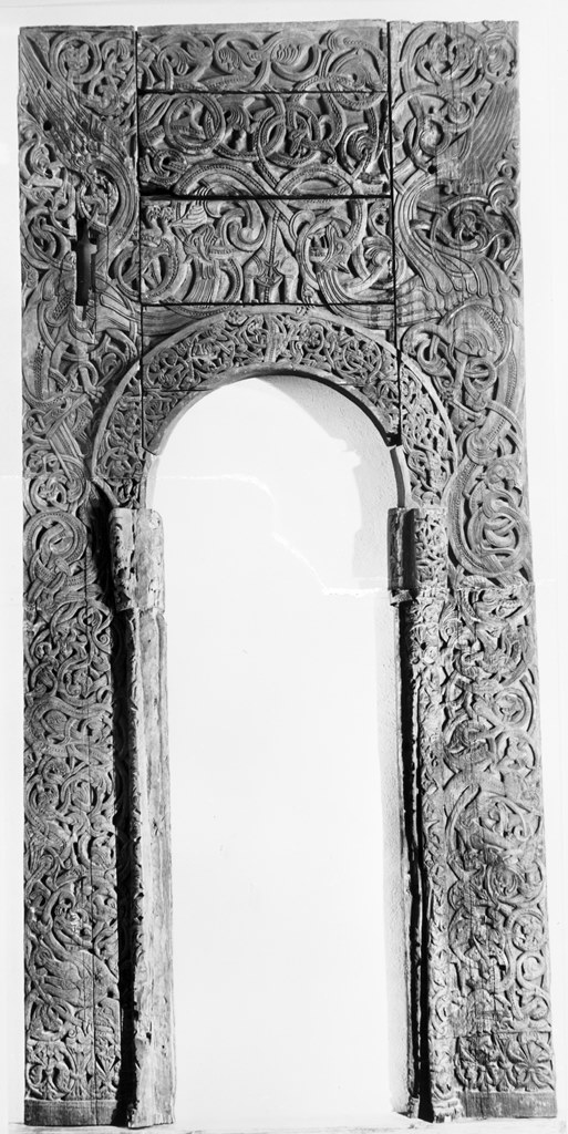 The scale first and foremost. The portal is huge compared to jewellry and illuminated manuscripts. It is gigantic even seen with other portals or stone monuments. The left plank of the portal is the widest plank found in the whole church, and possibly the widest plank in the Norwegian history of architecture. There was a very conciencous idea behind the format. One can clearly see that that big parts of the west front of the church, and maybe the other walls too have been decorated. The other wall planks with decorations, the still standing carved corner column, and of course the preserved tympanons give us an idea.
