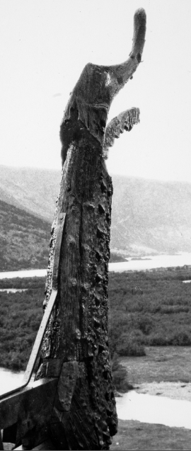 English: Tent post from the Gokstad find. Late 9th century. Round eyeballs with corners in both directions.