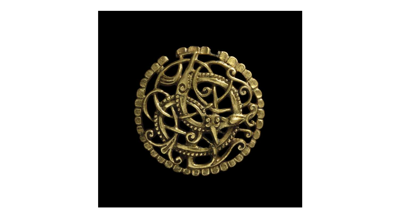 "Tilnærmet spiralformet bog og skinke på et seletøysbeslag fra Valsgärde i Sverige. Vendeltid."