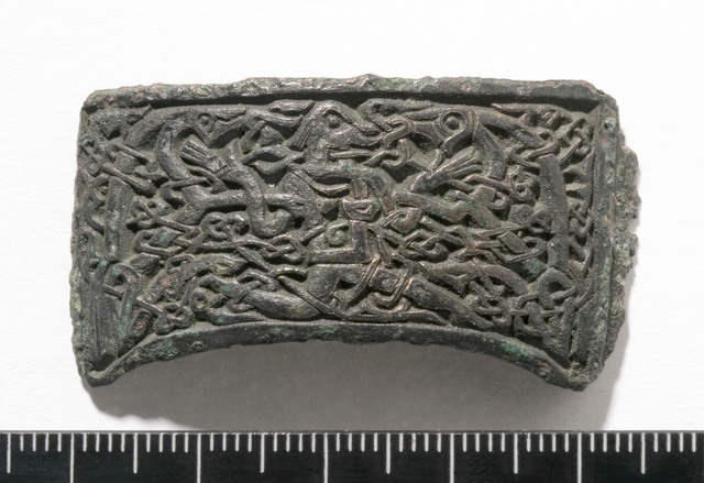 English: Beast and man in battle seems to be a timeless theme. Here on a scabbard mount from the migration period.