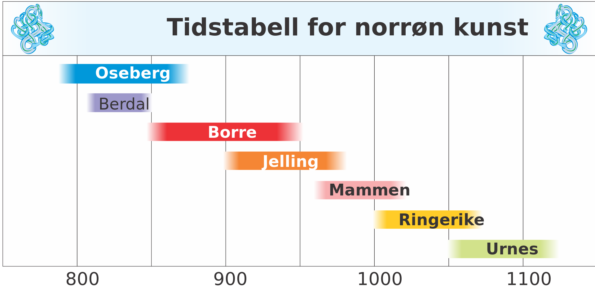 En skjematisk framstilling av vikingtidsstilartenes plassering i tid.