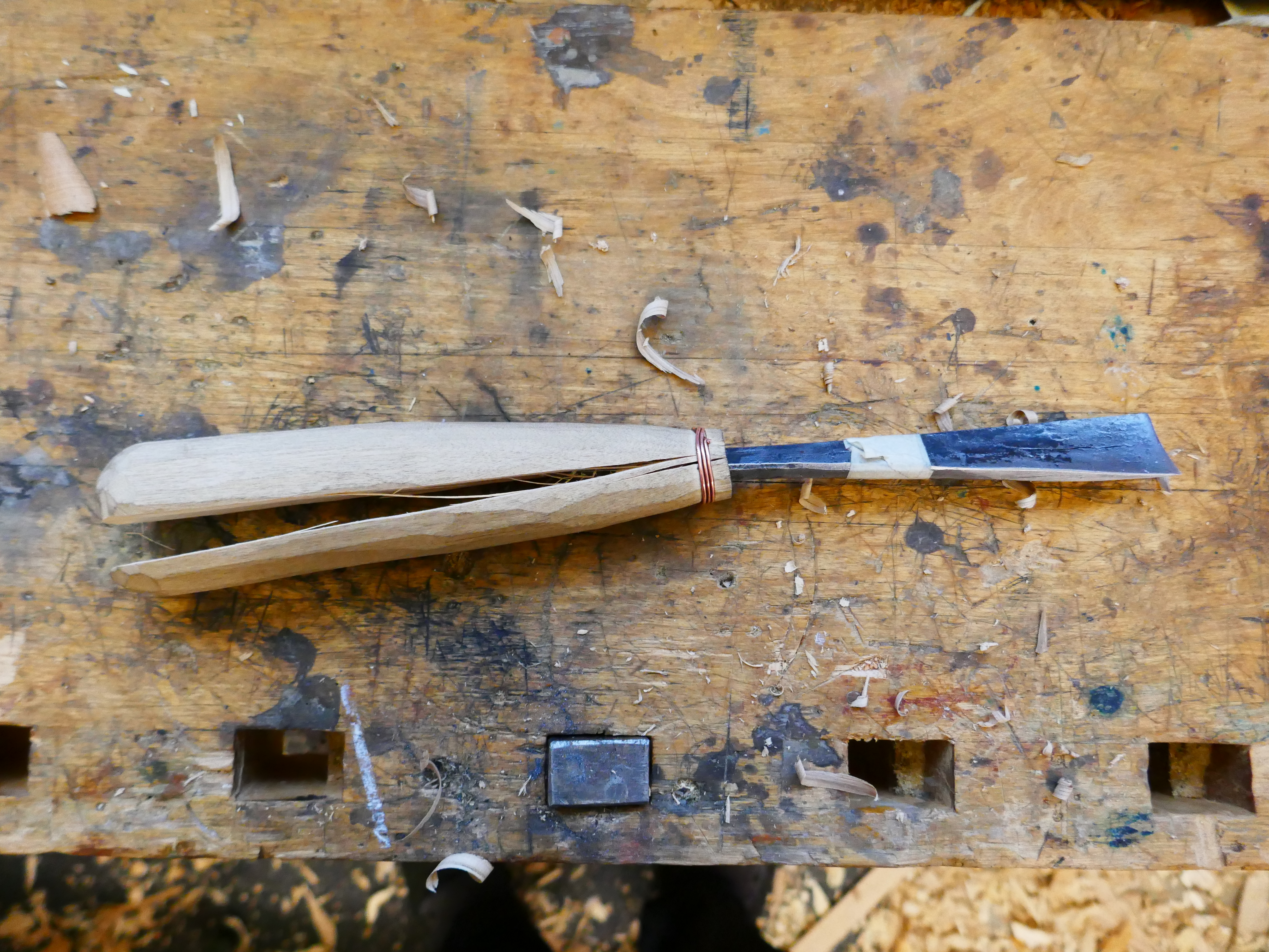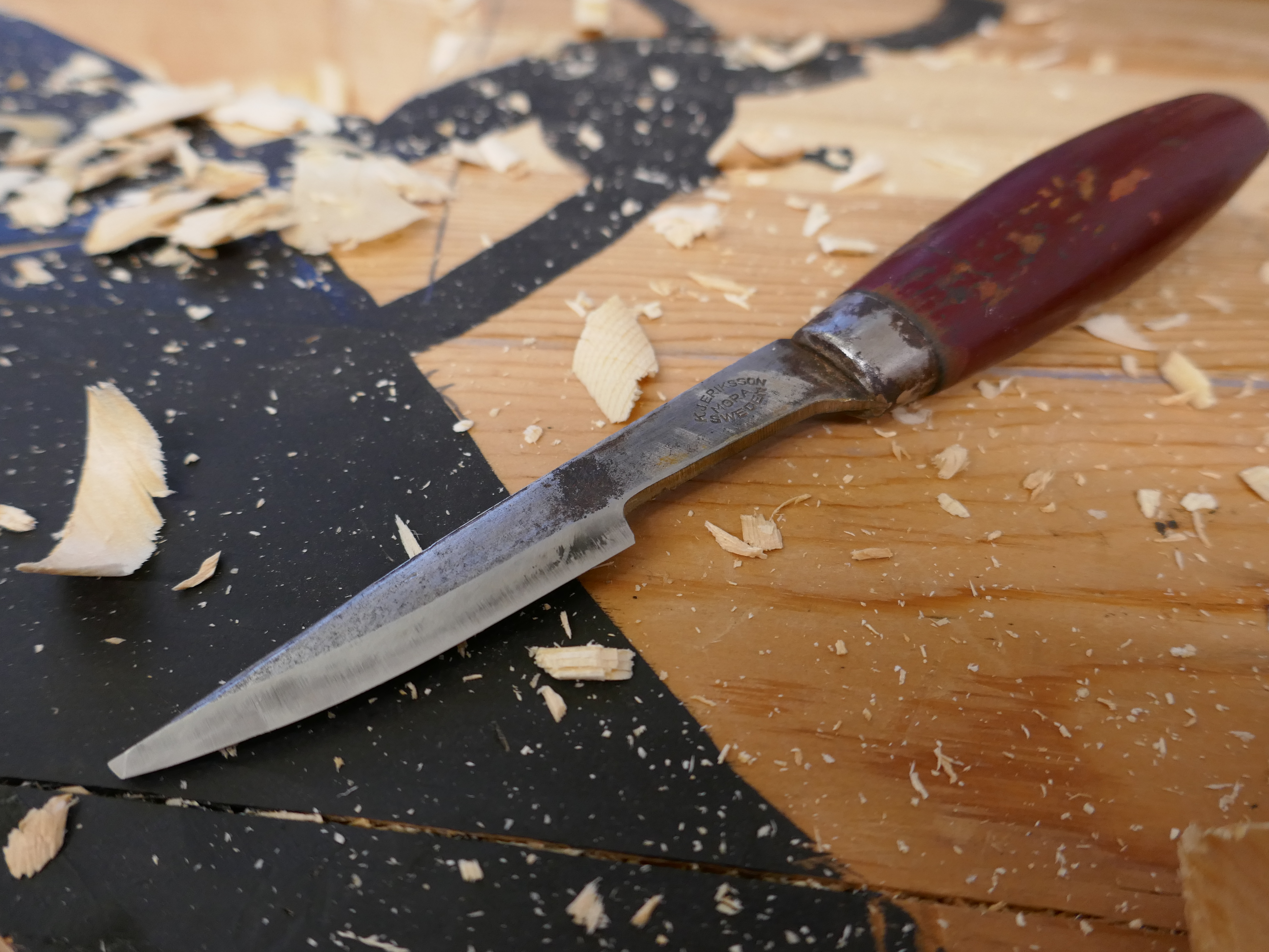 Kniven er virkelig grunnlaget for all treskjæring. Den er essensiell for enhver treskjærer, og håndverkere generelt. Den er kjapt fremme hvis det er en liten flis som må bort, en kantlinje som må strekke kjapt opp, eller en bunn som trenger en liten justering innerst i ett hjørne. Så det kan vi være helt sikre på at den var med de som skar originalen. Trygt på hofta, eller liggende i samme mappe som resten av jernene for å bevare den kniven som viste seg å være knallgod til akkurat skjæring. Kniver kommer i alle utforminger, og brukes til alt. Derfor er den også med i den metamorfosen som jernene. Utgangspunktet for den jeg bruker er en Morakniv av de litt større, som jeg da har omformet. Smalnet inn for å kinne stikkes i smale åpninger. På ett tidspunkt knakk spissen i ett nedstikk, og jeg bestemte da på en innskytelse å tverrslipe den avknekte tuppen slik at den fikk en ca 3mm bred "stemjernsegg". Dette skulle vise seg at det var veldig effektivt. Den ble knall til å stikk skarpe hjørner samtidig som den var robust nok til å tåle bruk. Den kunne brukes til så snitte kantlinjer i bunnene, rense vegger etc. Absolutt ett flerbruksverktøy.