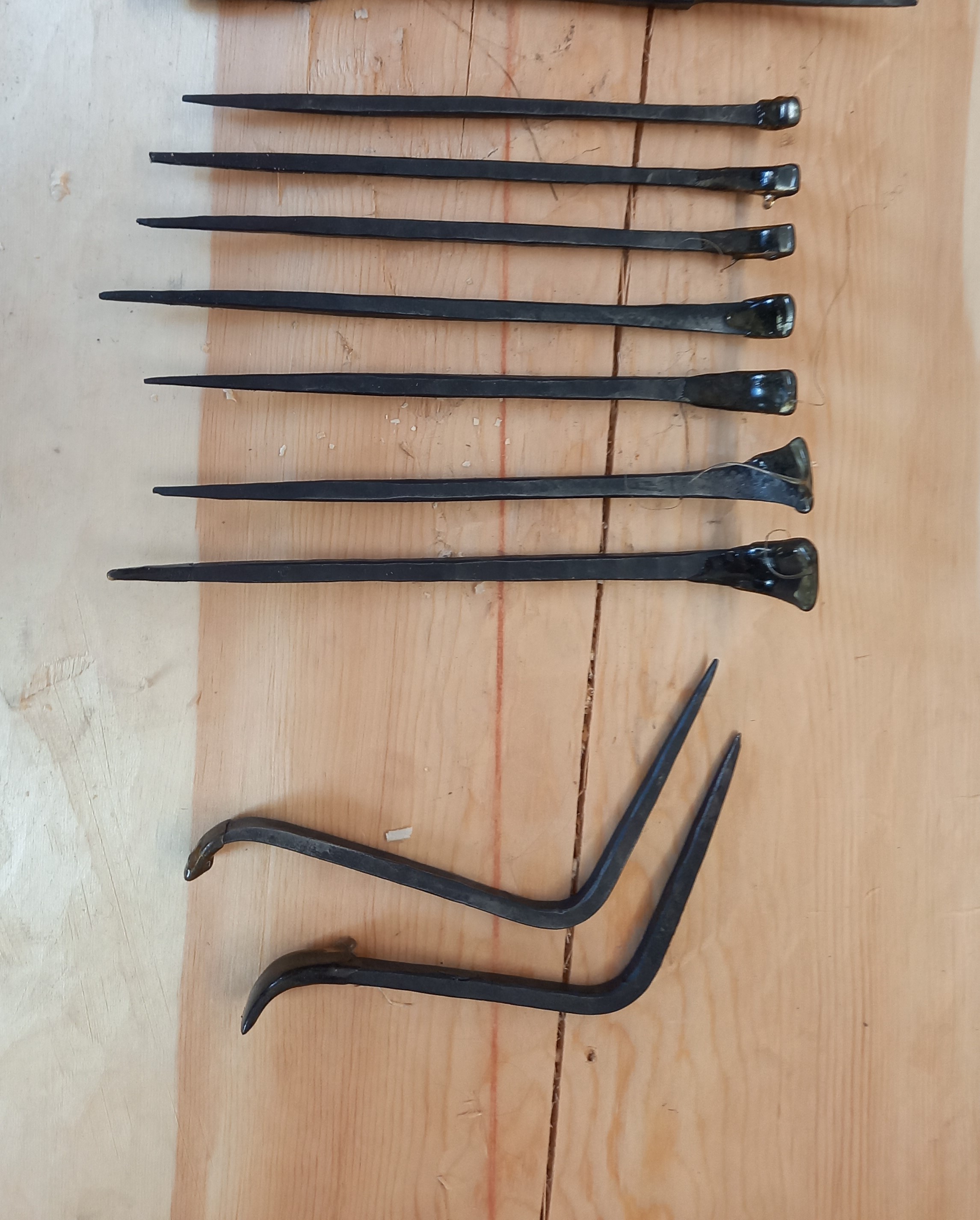 Vi visste på forhånd at det kom til å bli utfordrende å gjenskape de jernene som trengtes for å kopiere portalen. Når skjæringen er helt ned på 10cm dybde skaper det problemer for hvilke jern som er effektive (dette er beskrevet av B.Wiik i e tidligere blogginlegg, så bla tilbake og les med glede). Derfor samlet vi oss og brukte arkeologiske funn, avbildninger og annet til å utarbeide ett sett med jern, som hvert team skulle ha ett sett av, slik at vi hadde samme utgangspunkt når vi begynte skjæringen. Settet inneholdt grove faljern for grovarbeid, rette og buede stikkjern og bunningsjern. Alle kurvede jern hadde samme bue og bredde som vi fant spor av i originalportalen.