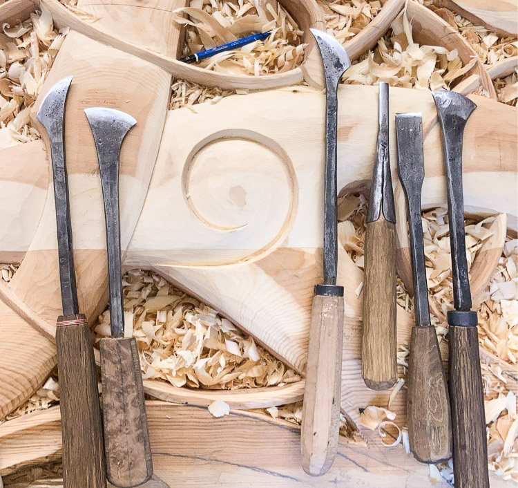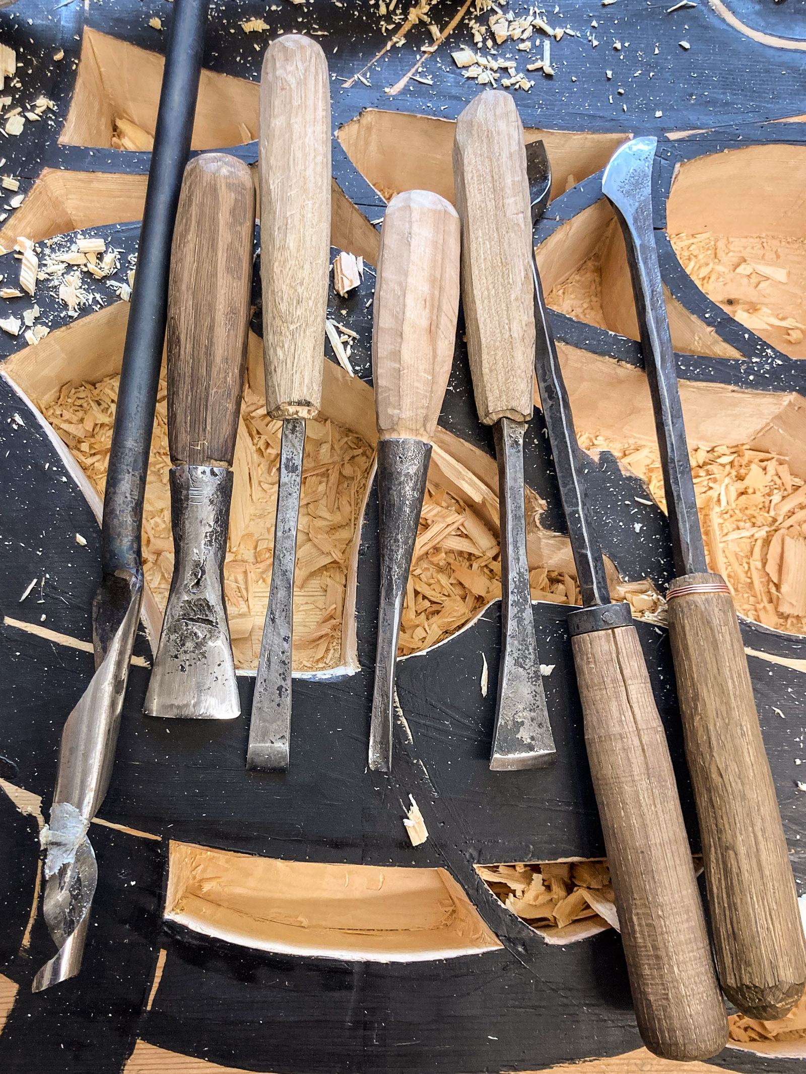Til slutt, etter alle disse timene med skjæring, akkumulert refleksjon og opparbeida magefølelse har jeg forsøkt å plukke ut det settet jeg selv ville hatt med videre om jeg skulle skåret dette på nytt. Verdt å merke at det tross alt er ett bunnjern i settet, og at den nedslipte tollekniven er med i utvalget selv om jeg selv har vært tvilende til å regne inn den. En kan godt skjære en Urnesportal med et helt anna utvalg, men dette var det som føltes rett for meg.