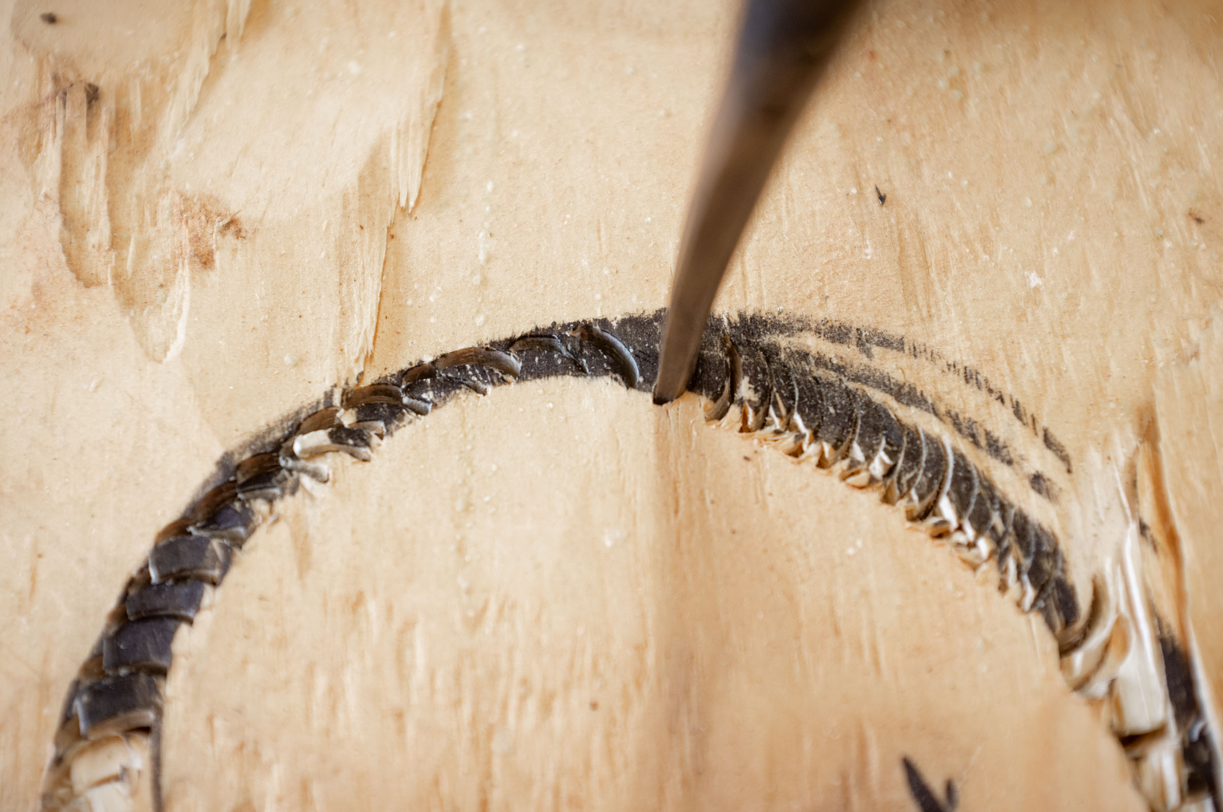 Ser en likevel på skannet av portalen, i bunnen av bakre/venstre hoftekrøll på det firfotede dyret, åpenbarer det seg ikke bare ett men minst fire potensielle stoppspor fra et omkring 7,3 mm bredt krumt jern. De er alle orientert på tvers av vedretninga, også i partier der retningen på sporet avviker betraktelig fra plankens lengderetning. Nærmere studier av disse sporene må nesten gjøres på originalmaterialet direkte, men dette var et overbevisende nok utgangspunkt til at jeg ville gjøre noen praktiske tester.