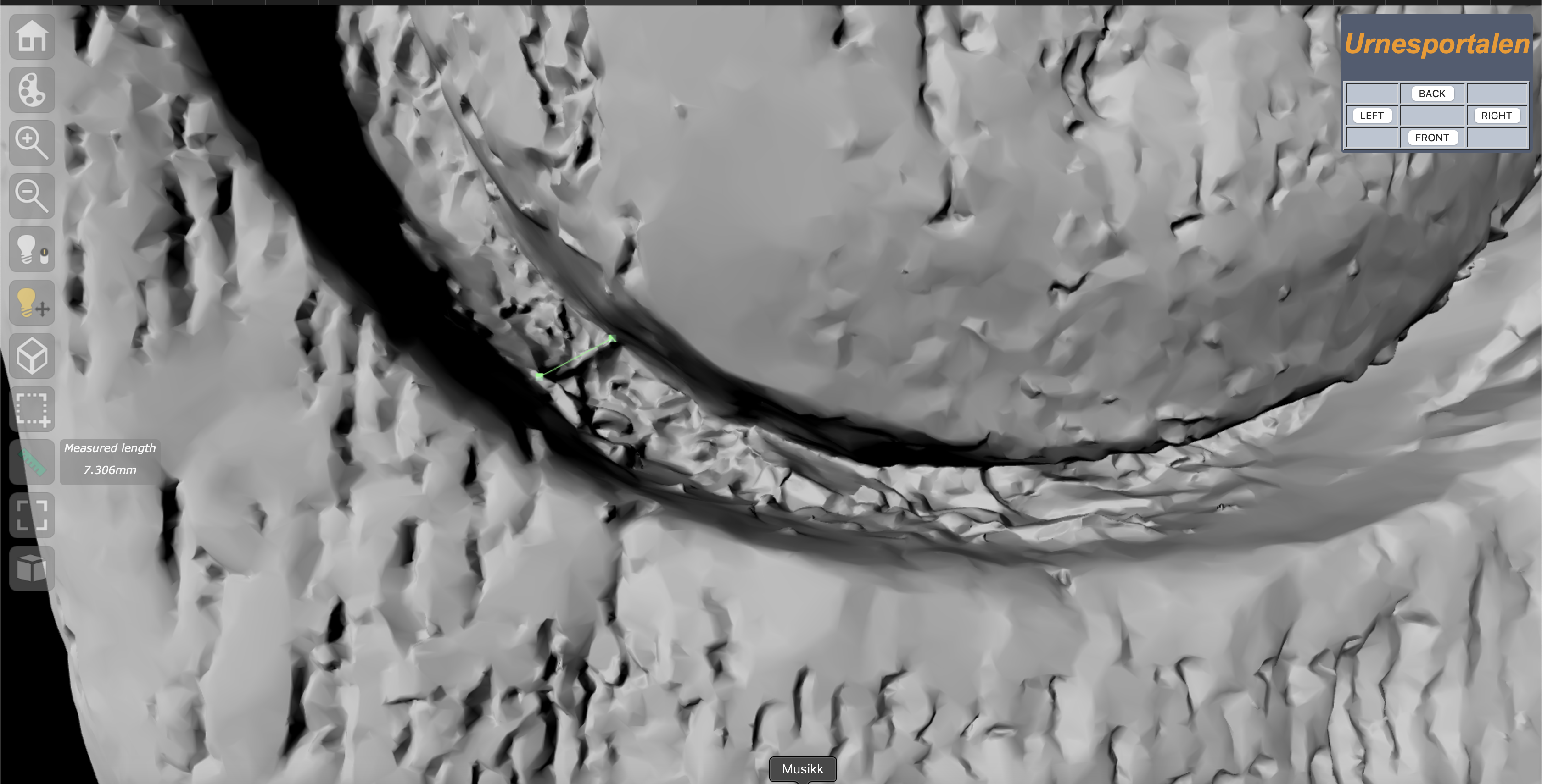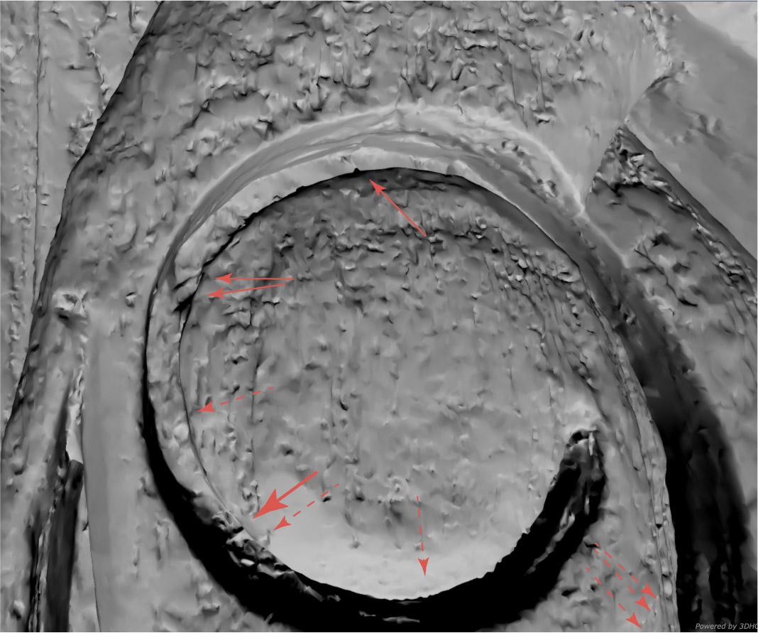 Siden skjæringen av hoftekrøllene kommer senere i prosessen enn arbeidet med å bunne ornamentene ble de ikke tatt med i betraktningen i forrige innlegg. Like etter at det innlegget ble publisert ble likevel disse spiralene gjenstand for diskusjon på et statusmøte i prosjekt Treets mester, og etter denne diskusjonen tok jeg en ny kikk på 3D-skannet. Dette innlegget er skrevet ut fra detaljer oppdaget i scannet etter publiseringen av forrige innlegg, og funn fra en praktisk utprøving av metoden på en kopi av en hoftekrøll. Dette bygger på forrige innlegg «Langsmale åpninger», og det bør leses før dette.