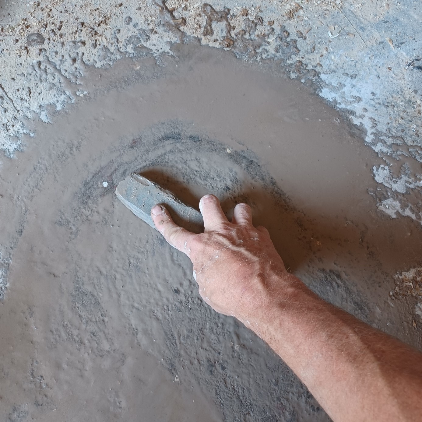 Brynet slipes på sementgulvet, til det har de ønskede flater. Støvet som kommer i denne prosessen kan samles opp og brukes på slipestikker, Slipestikker er pinner som smøres inn med tjære, kvae eller andre klebrige stoffer , og hvor dette støvet så gnis inn( Foto: Boni Wiik)