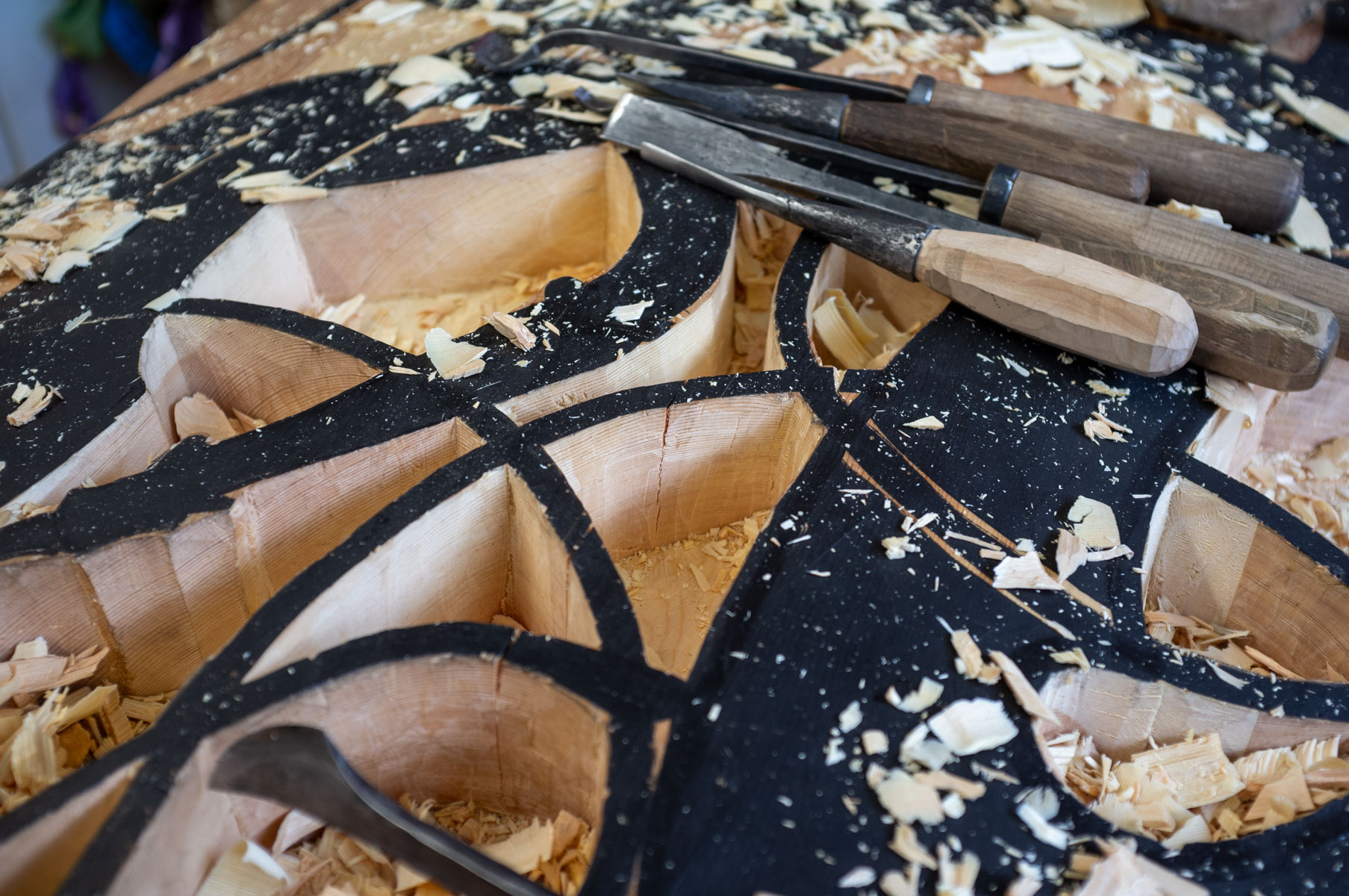 Når vi nå har grovforma ornamentet på venstre portalplanke har vi gjort det relativt på øyemål, utover å bruke helt enkle måleredskaper for å sjekke at vi er dypt nok langs midten. Jeg har de siste dagene ettergått dette arbeidet og ser at vi mange steder er innenfor millimetre fra fasiten, som er mindre avvik enn det er mellom tilliggende bunnner på originalen.