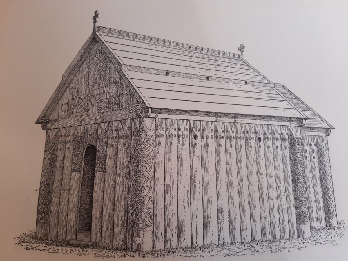 "Hemse stavkirke, slik den engang kan ha sett ut."