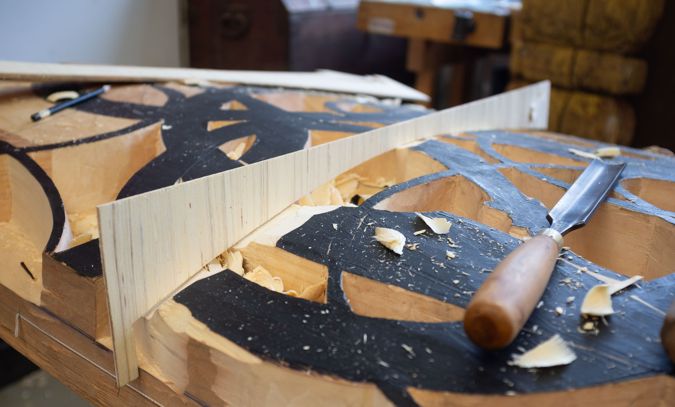 En annen tilnærming til denne utfordringen var slik vi fra Treskjærerverkstedet på Fornebu gikk fram da vi sto og skar på Ornes i sommer. Da hadde vi som mål å skjære mest mulig, både for å vise fram håndverket for de besøkende, og for å teste verktøy og teknikker. Vi valgte derfor å lage en kopi av den utskårne hjørnestolpen som ellers ikke er del av prosjekt «Treets mester». Dette lot oss både jobbe friere, og slippe transportutfordringene og risikoen med den store venstreplanken. Siden denne hjørnestolpen ikke skulle stilles ut på slutten av prosjektet, og emnet var relativt rimelig, kunne vi gjøre oppregning og kopiering relativt på øyemål. Jeg skal ikke påstå at vi klarte å løsrive oss helt fra moderne tanker om nøyaktig kopiering, og vi støtta oss blant annet på et rutenett for å hjelpe kopieringen som neppe ville vært benyttet da de komponerte ornamentet opprinnelig. Men prosessen ble friere, og mer basert på faglig intuisjon. Og samtidig, fordi vi gjorde kopieringen såpass intuitivt og på øyemål – kanskje noe mer «prosessuelt autentisk» enn den enda mer metriske (oppmålings-baserte) kopieringen vi ellers gjør, gikk vi glipp av en del detaljer. Fordi vi var engasjert i prosessen ble disse detaljene synlige for oss først i det vi hadde kommet for langt til å inkludere dem i «kopien».