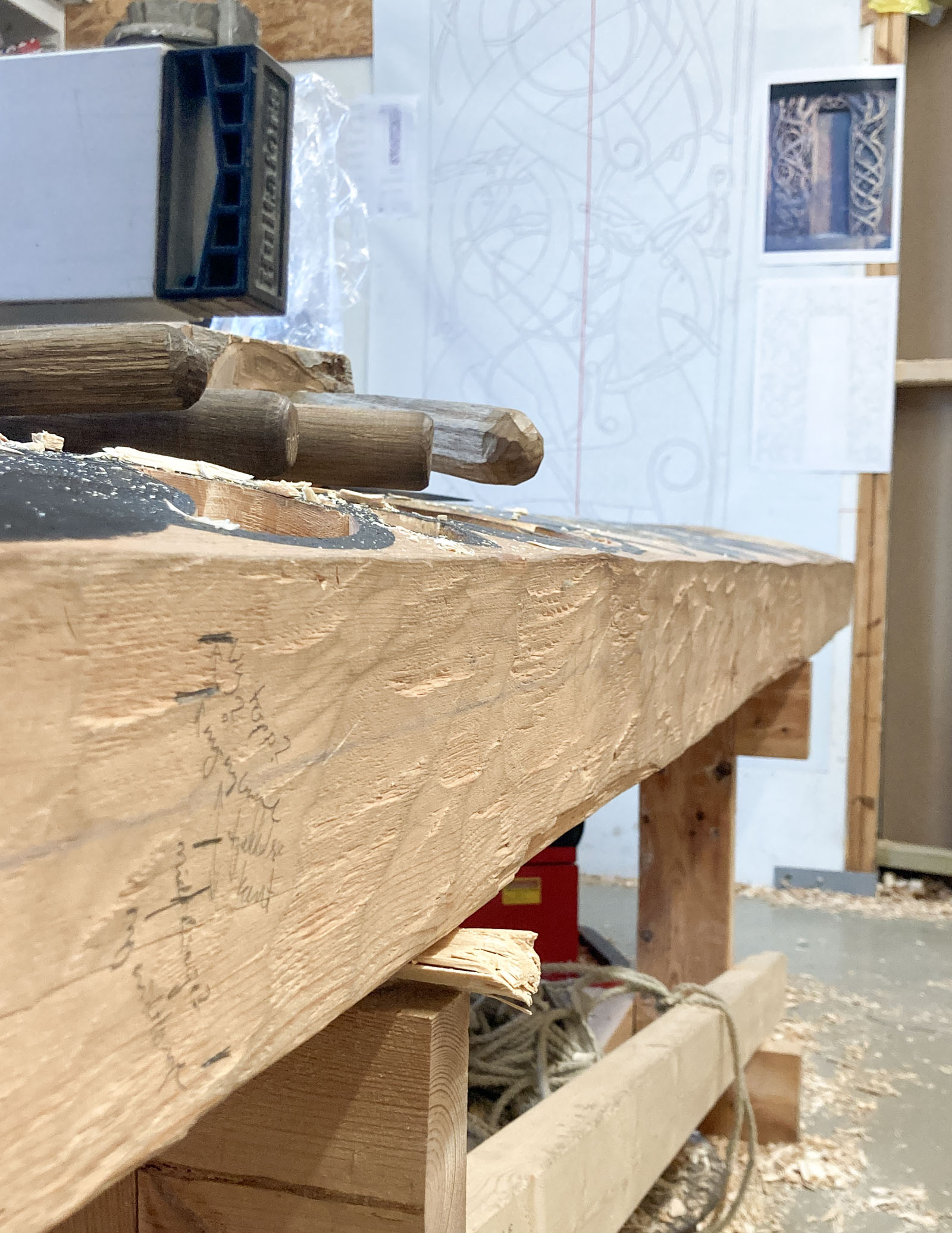 Vi skjærer for tiden på en kopi av Urnes stavkirkes ikoniske nordportal - kanskje et av de mest reproduserte stykkene viking/middelaldertreskjæring vi har. I kontrast til de aller fleste, om ikke alle, de tidligere kopiene har vi et mål om prosessuell autentisitet. Dette betyr for oss at så mange som mulig av prosessene gjøres med verktøy, utstyr, teknikker og materialer som de som opprinnelig var benytta for 960 år siden.