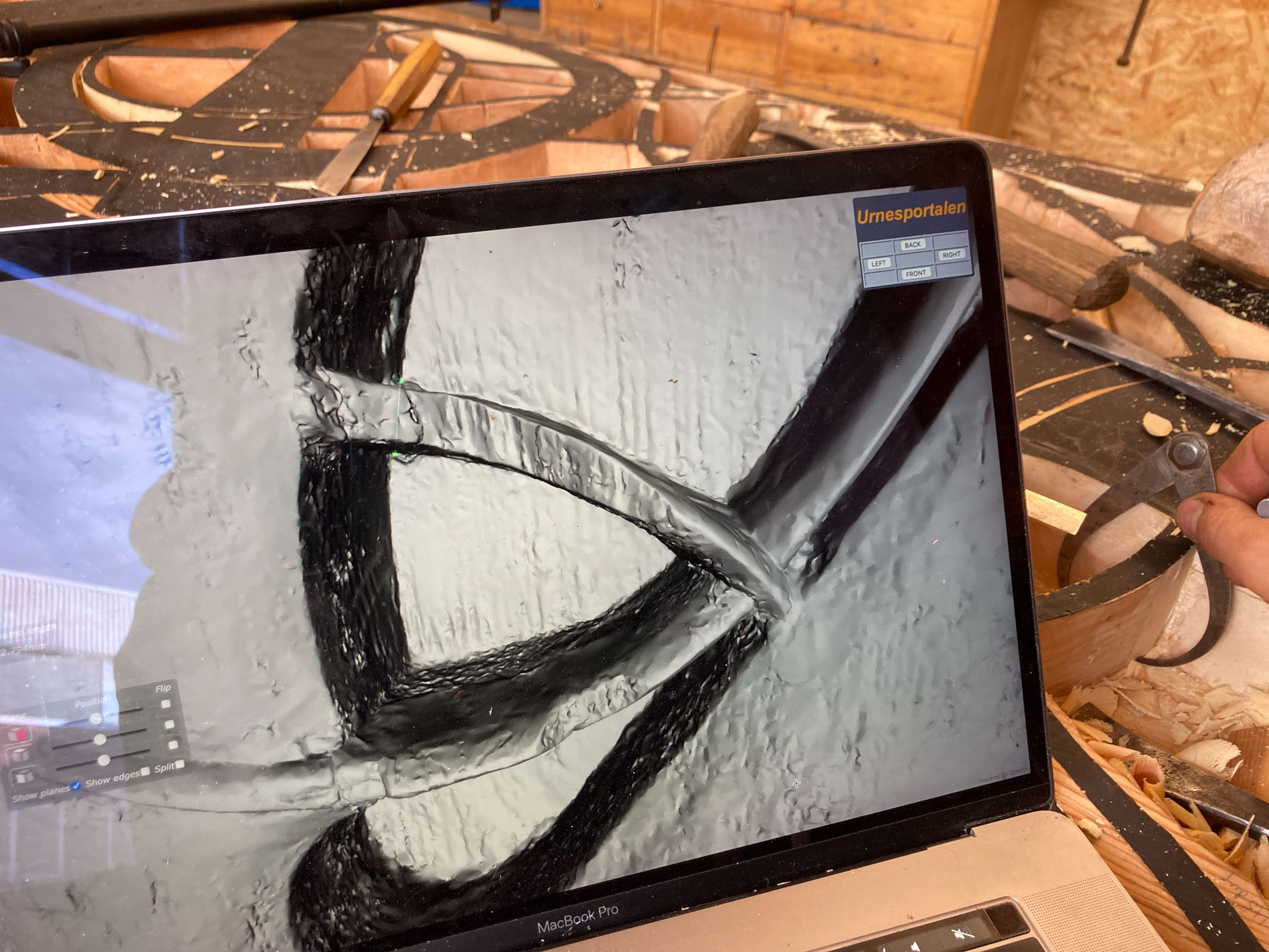 Samtidig må vi ikke tro prosessuell autentisitet utelukkende står i veien for estetisk resultat. Om en blir for opphengt i målingen, og mister bevisstheten om hvordan ornamentet opprinnelig var skåret, er jeg redd vi også mister estetisk kvalitet i kopien. Et eksempel handler om å få fram den elegante formen på de slyngende dyrekroppene som utgjør ornamentet. Ser en på snitt gjennom portalplankene ligger de fleste kroppene helt ut mot den opprinnelige bua overflaten på planken, og hadde vi kun jobbet «metrisk» på millimetermål fra 3D-scan og glemt denne formal-logikken i ornamentet er jeg redd flyten i utskjæringene ville blitt skadelidende. Ikke fordi det er noe feil med 3D-scannet i seg selv, men fordi en slik kopieringsprosess vil innebære å overføre hundrevis av målepunker, hver med sin egen mulighet for menneskelig feil. Hver måling blir også et brudd i flyten som skal til for å skjære spenstig og rent.