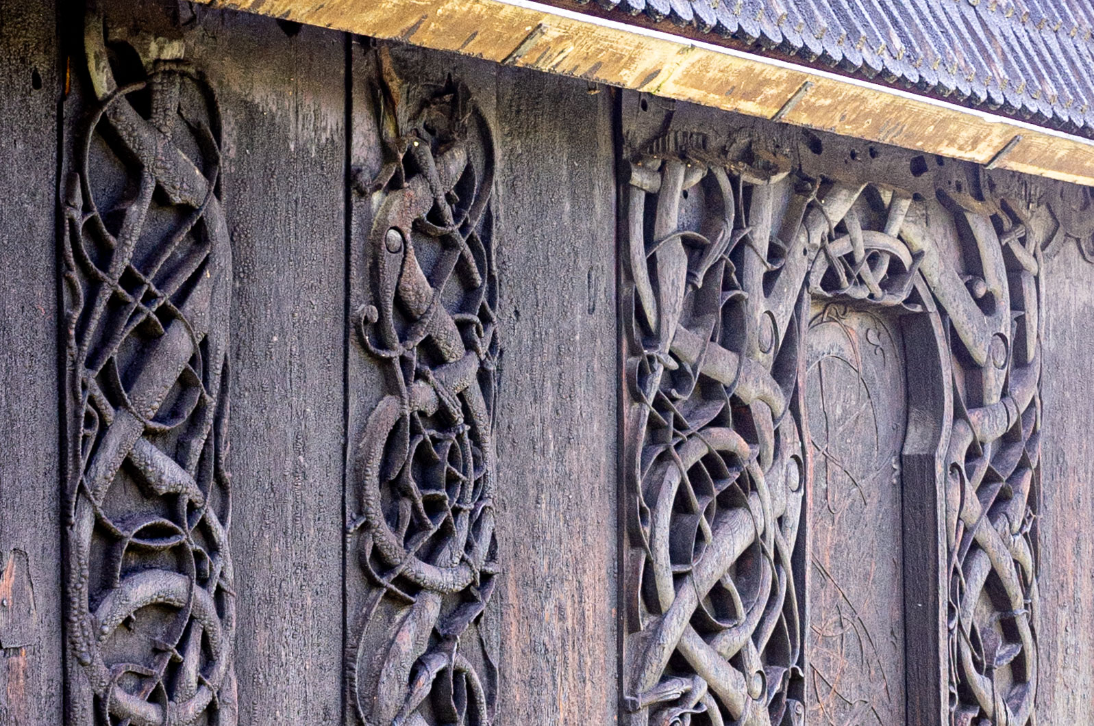 Da portalen og andre materialer fra Urnesstilens kirke på 1130-tallet ble gjenbrukt, ble de alle betydelig korta ned i lengde uten særlig hensyn til ornamentikk og utsmykking. Den fantastiske bevaringsgraden på de gjenværende ornament, og sporene vi kan se av en del av det som er borte, har vært opphav til over hundre og femti års spekulasjon omkring hvordan de tapte felt kan ha sett ut opprinnelig (Hauglid 1976 s. 226)(Krogh 2011 s. 218).
