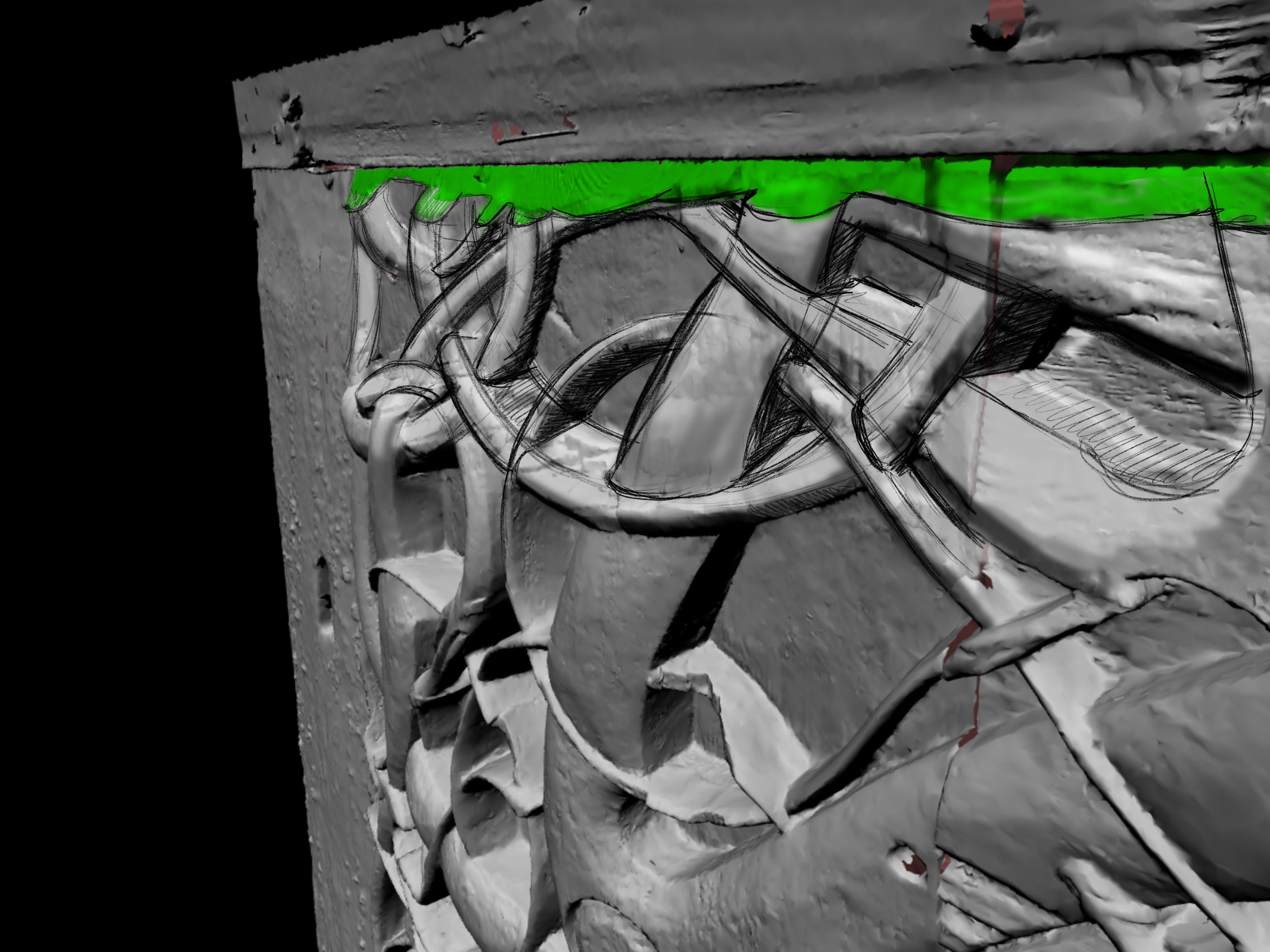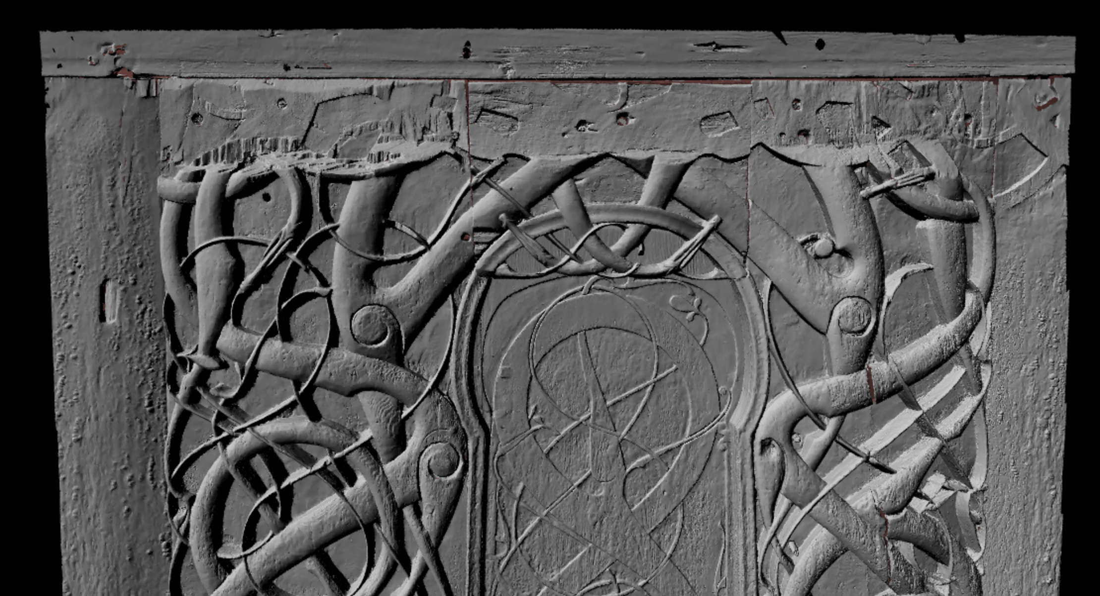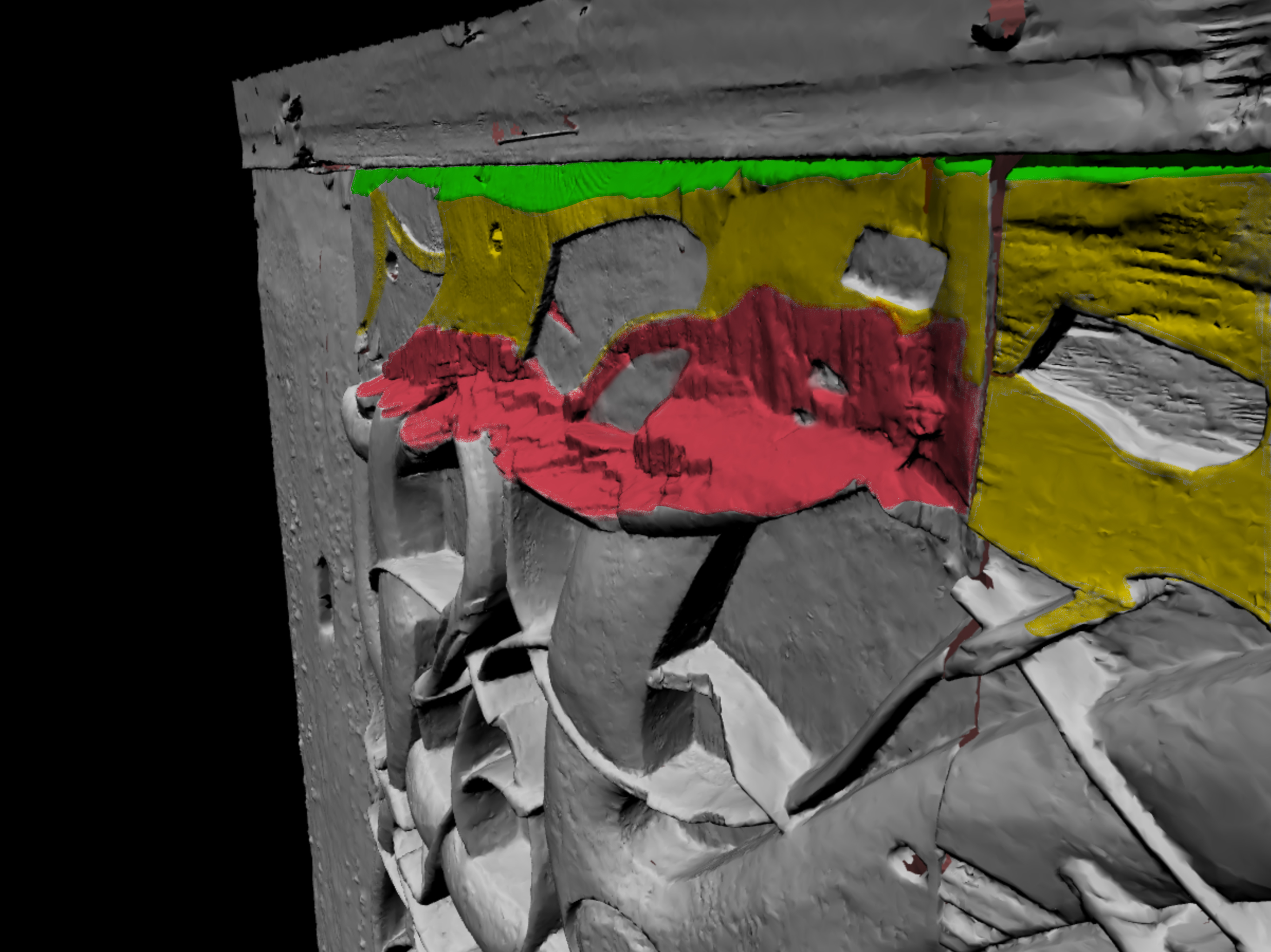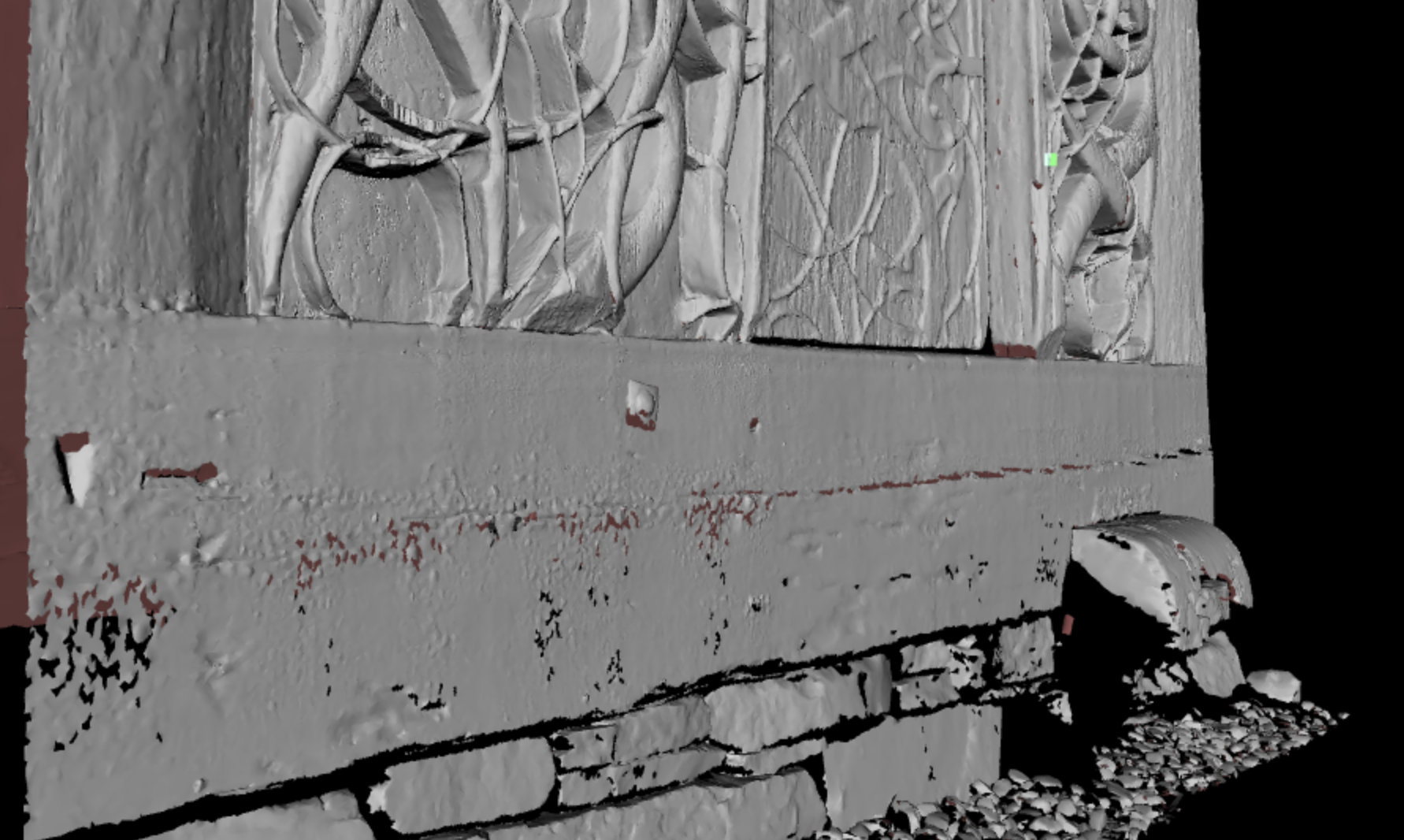 Jeg har forsøkt å illustrere de ulike huggede flatene med farge oppå 3D-scannet av portalen. De grønne flatene indikerer flater som nødvendigvis må ha vært hugget i prosessen med tilpasning inn i veggen på den nåværende kirka. Rødt indikerer flater som er så grove, preget av røff hugging og avbrekking av biter som passer best med en senere justering in situ, antakelig i det en har ettermontert feste for svalgangens tak. De gule flatene er vanskeligere å bedømme, men det virker rimeligere at de er sekundære enn at de er del av byggeprosessen i 1130.