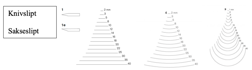 forskjellige grader og størrelser. De følgende maal gjælder især saadant verktøy eller redskaber som gjelder til udførelsen av smaa eller middelsstore træ eller beinskjærearbeider, til større f.eks. statuer udkræves der større og sterkere værktøy.