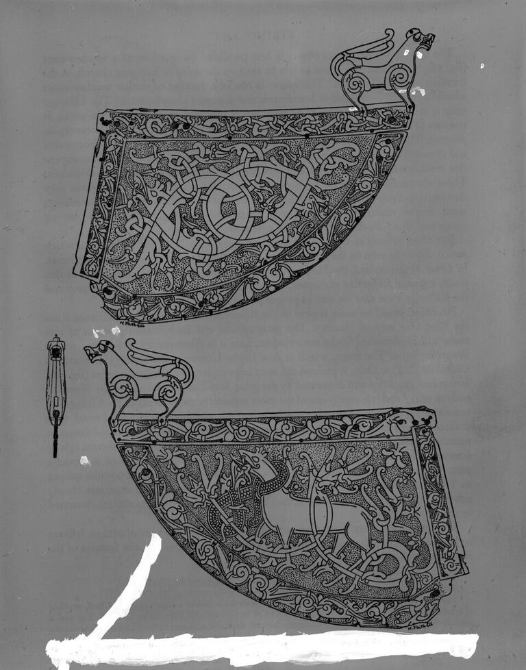 "Tilnærmet spiralformet bog og skinke på et seletøysbeslag fra Valsgärde i Sverige. Vendeltid."