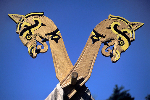 "Dyrehode i tre fra 900-tallet, i jellingestil. Framover spissende øye, og neseslynge."