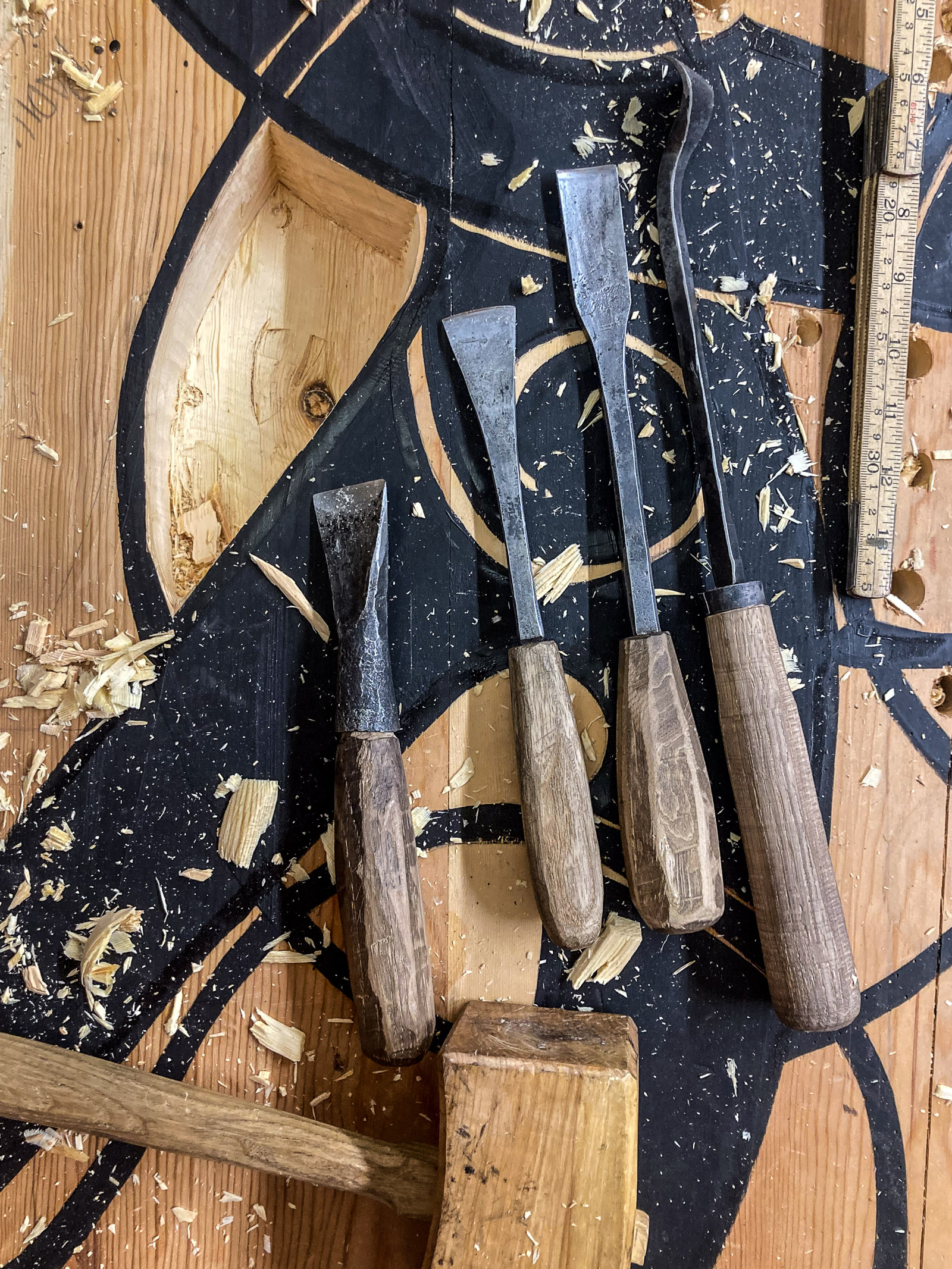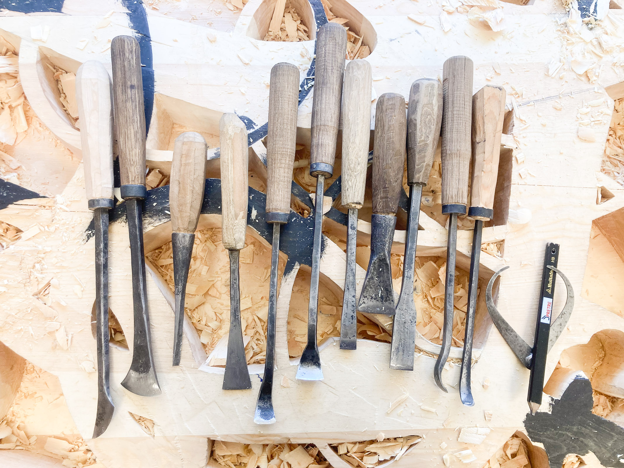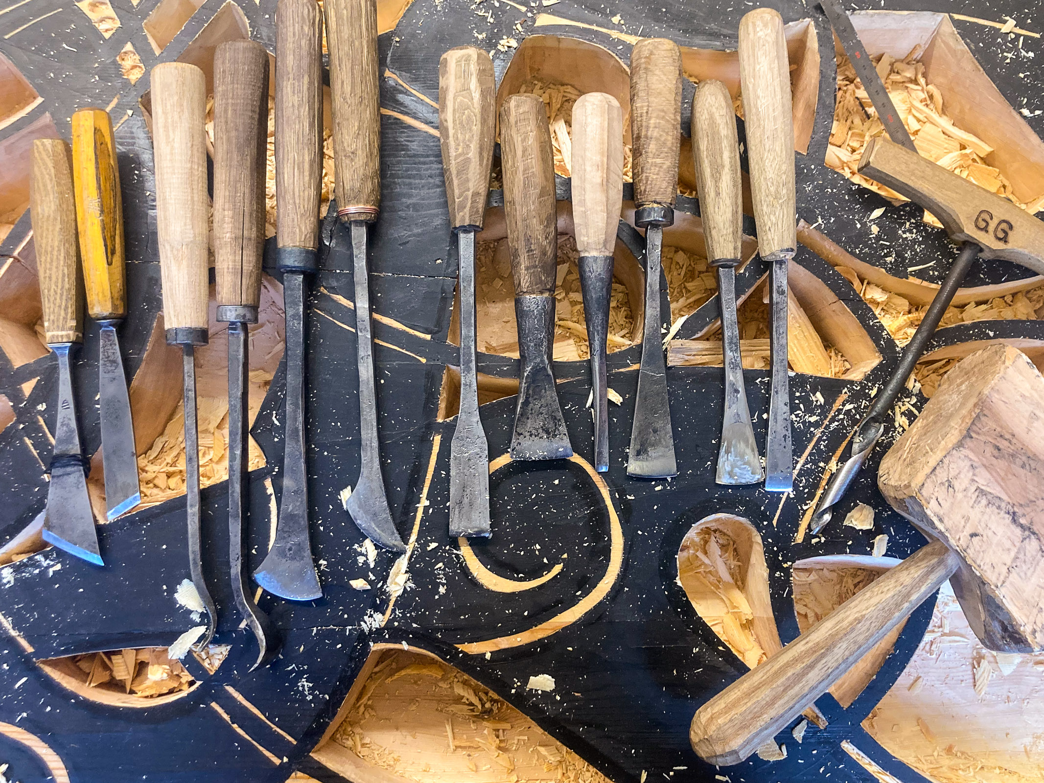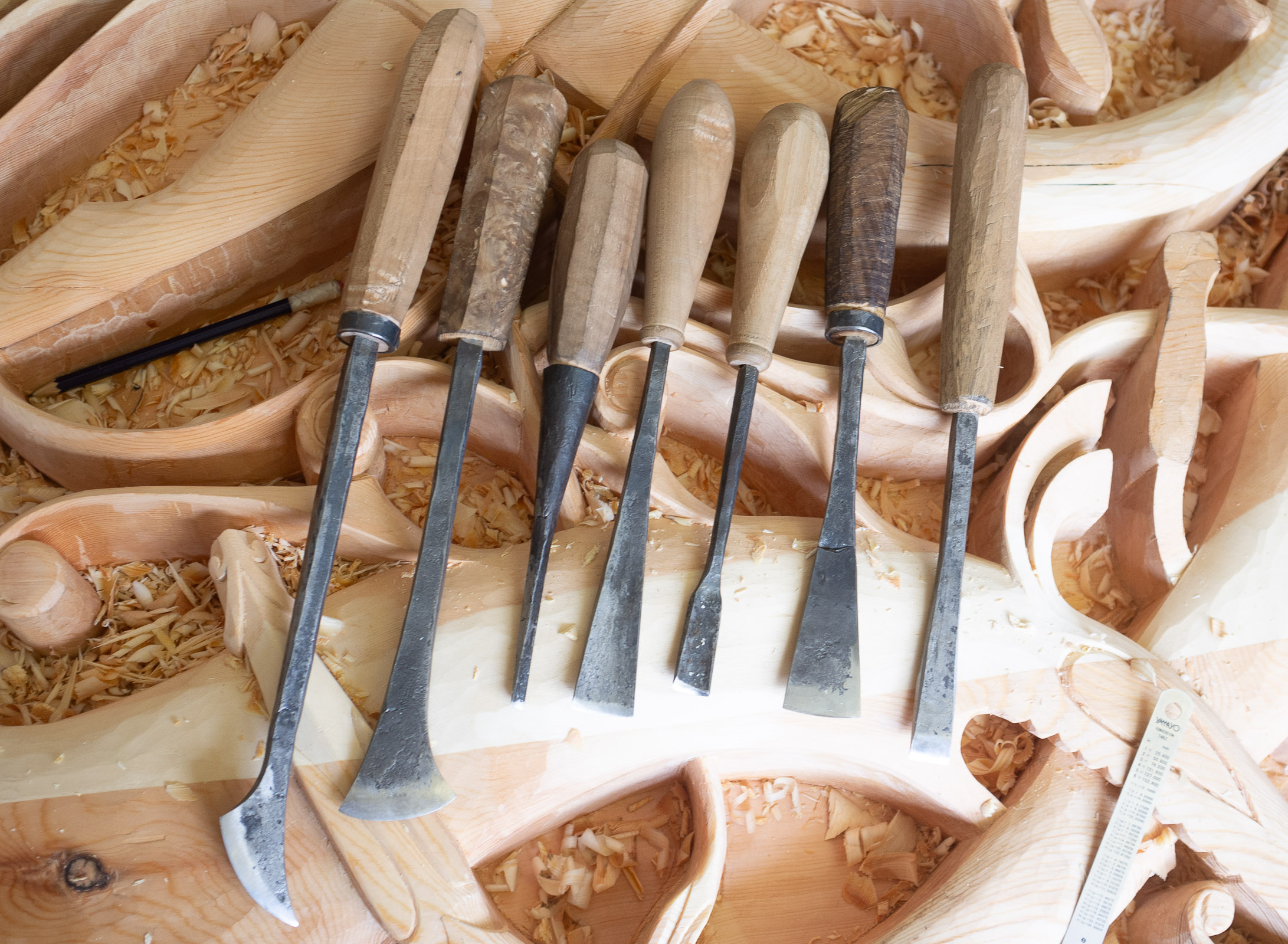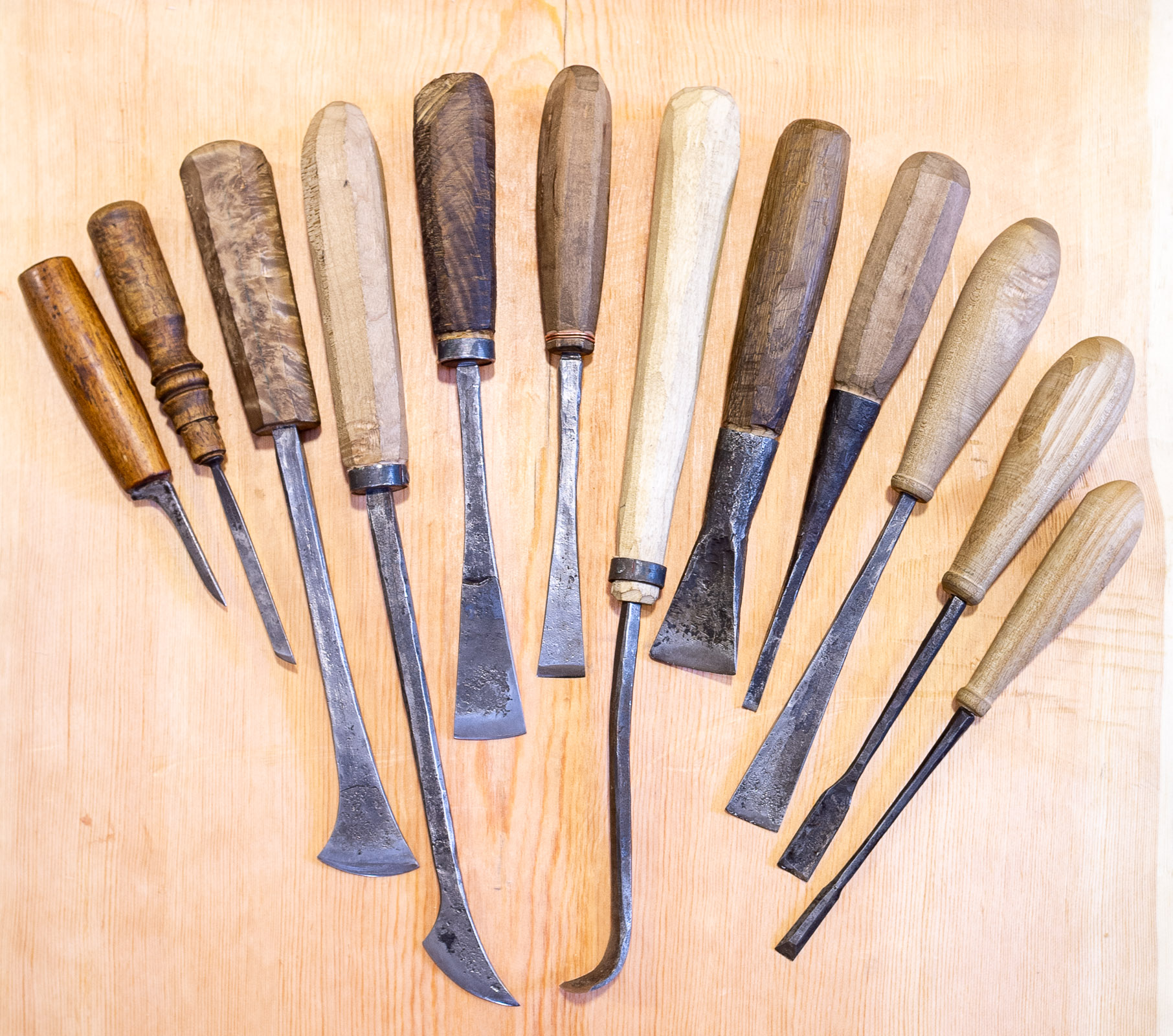 Til slutt, etter alle disse timene med skjæring, akkumulert refleksjon og opparbeida magefølelse har jeg forsøkt å plukke ut det settet jeg selv ville hatt med videre om jeg skulle skåret dette på nytt. Verdt å merke at det tross alt er ett bunnjern i settet, og at den nedslipte tollekniven er med i utvalget selv om jeg selv har vært tvilende til å regne inn den. En kan godt skjære en Urnesportal med et helt anna utvalg, men dette var det som føltes rett for meg.