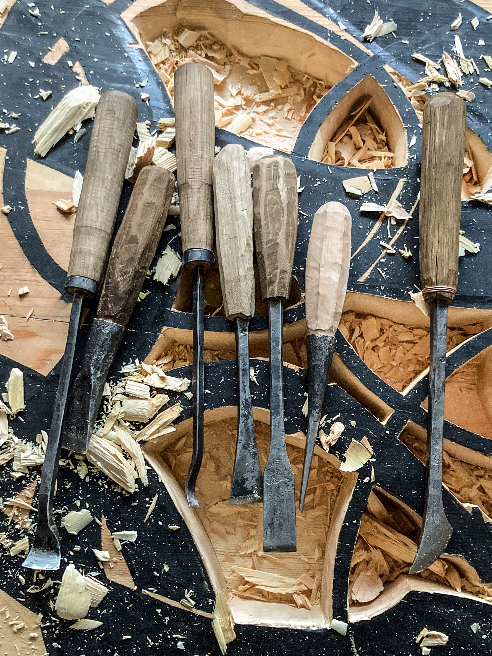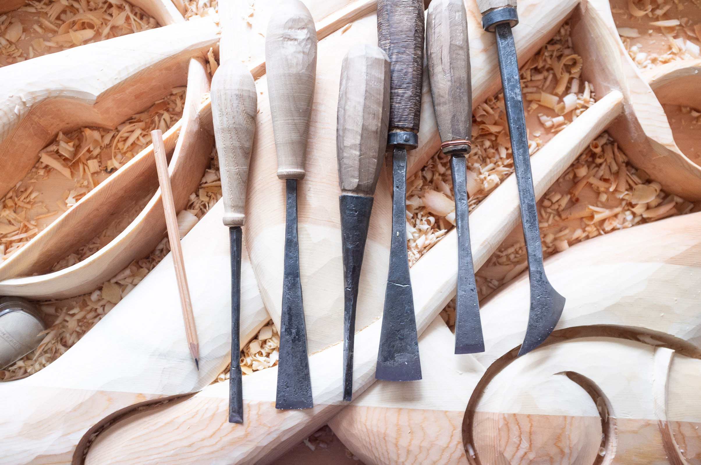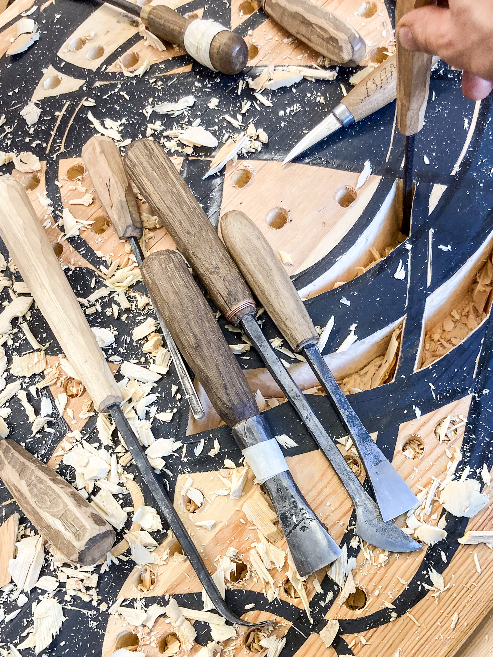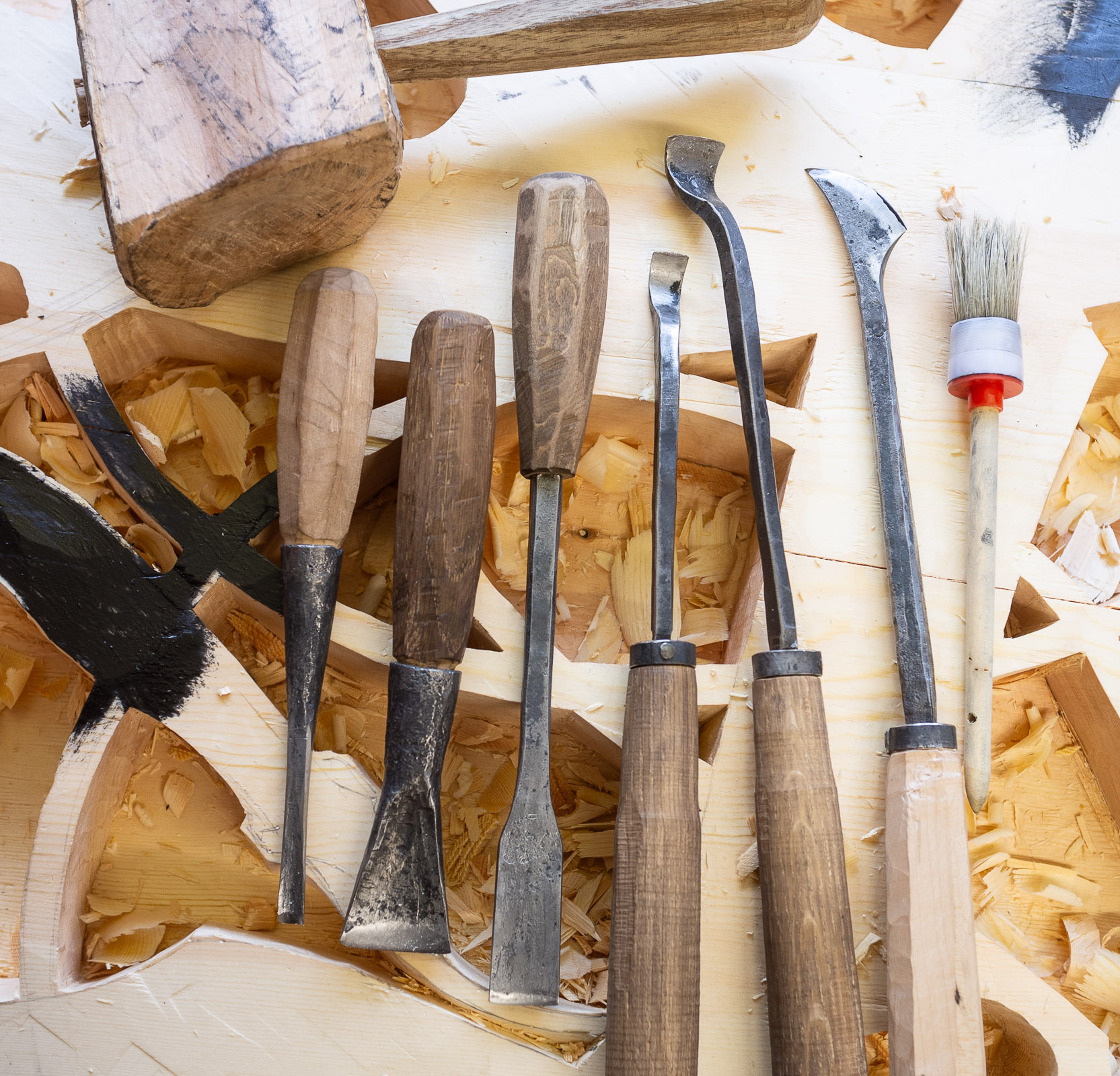 Til slutt, etter alle disse timene med skjæring, akkumulert refleksjon og opparbeida magefølelse har jeg forsøkt å plukke ut det settet jeg selv ville hatt med videre om jeg skulle skåret dette på nytt. Verdt å merke at det tross alt er ett bunnjern i settet, og at den nedslipte tollekniven er med i utvalget selv om jeg selv har vært tvilende til å regne inn den. En kan godt skjære en Urnesportal med et helt anna utvalg, men dette var det som føltes rett for meg.