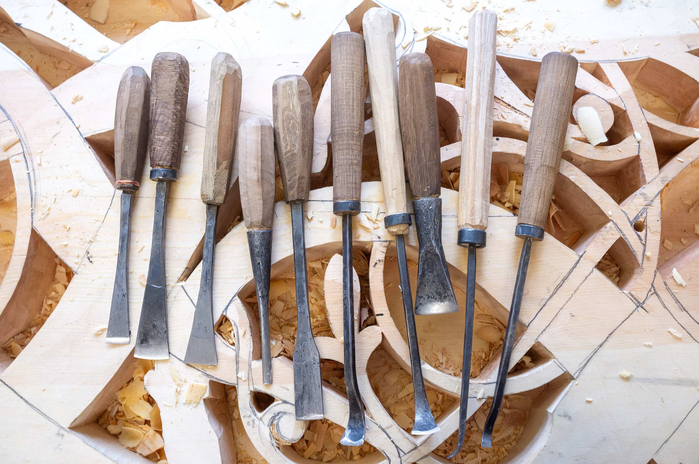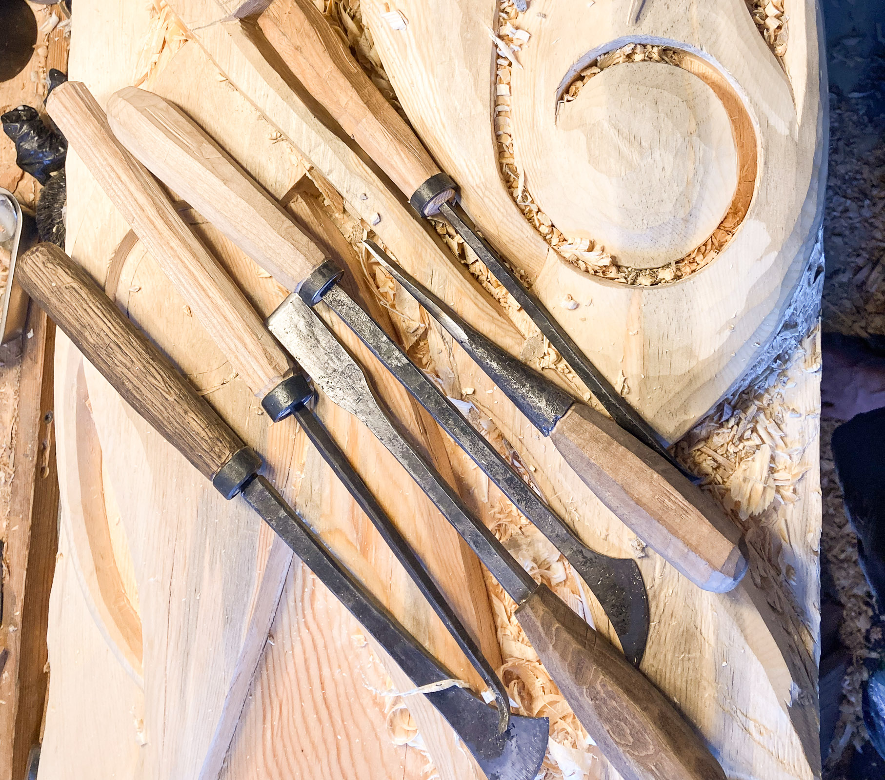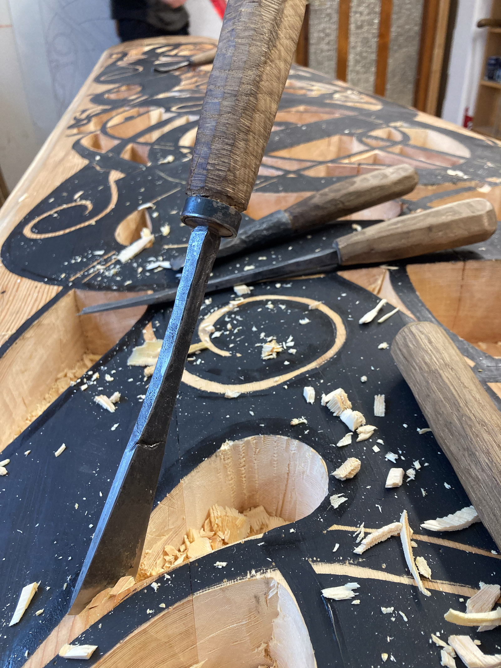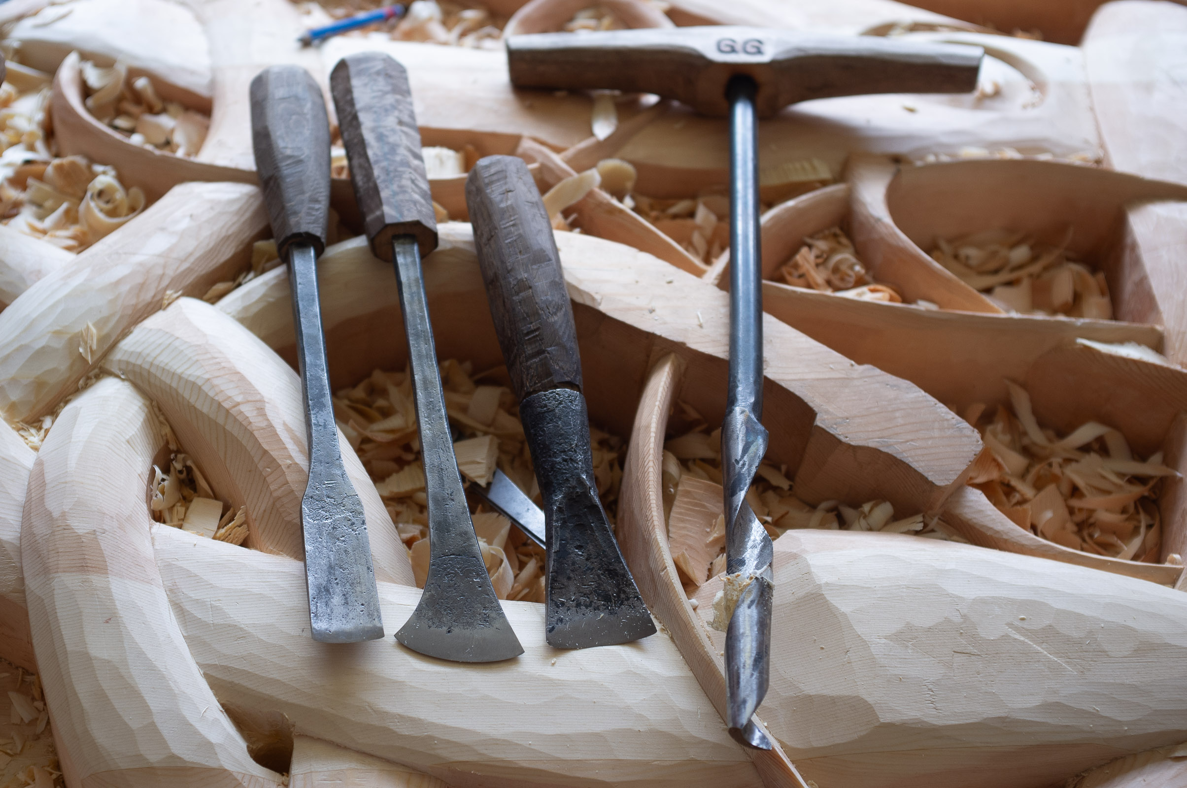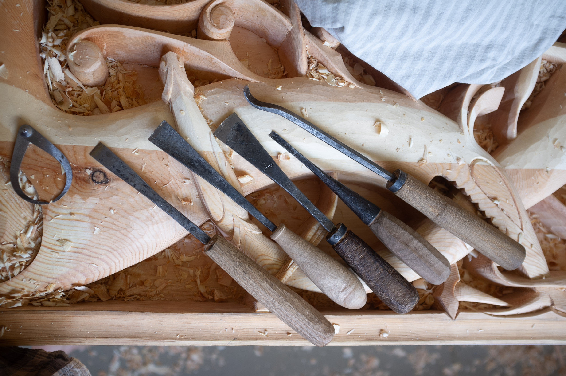 Til slutt, etter alle disse timene med skjæring, akkumulert refleksjon og opparbeida magefølelse har jeg forsøkt å plukke ut det settet jeg selv ville hatt med videre om jeg skulle skåret dette på nytt. Verdt å merke at det tross alt er ett bunnjern i settet, og at den nedslipte tollekniven er med i utvalget selv om jeg selv har vært tvilende til å regne inn den. En kan godt skjære en Urnesportal med et helt anna utvalg, men dette var det som føltes rett for meg.