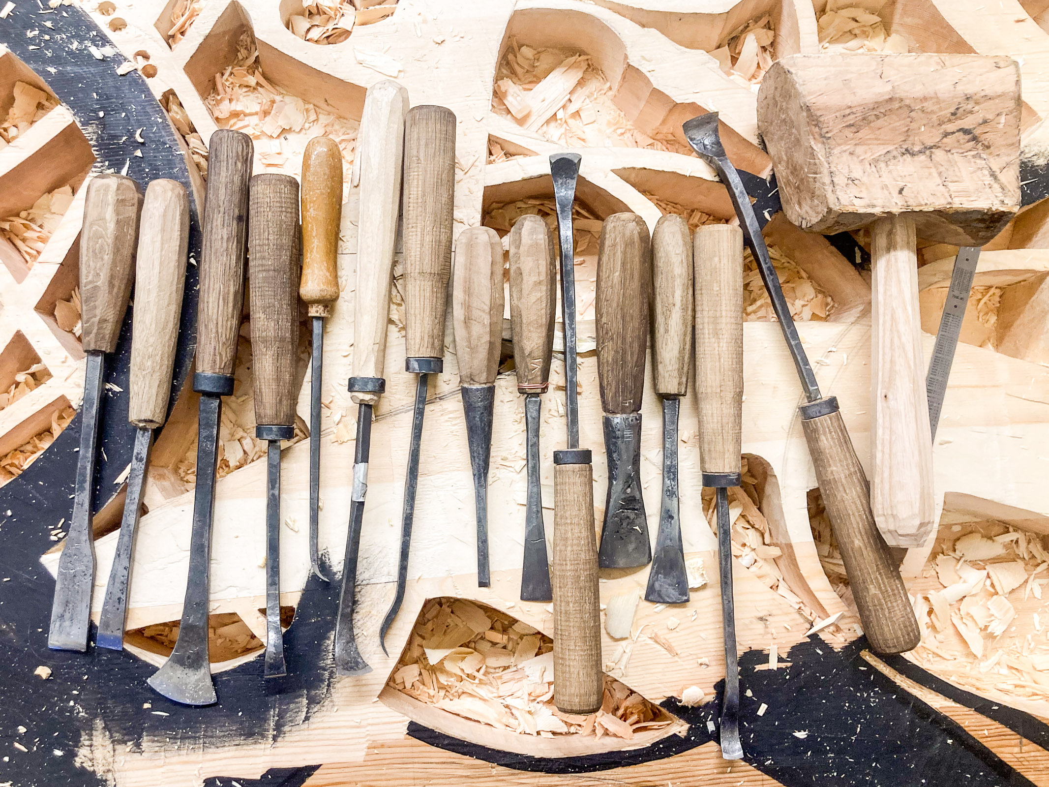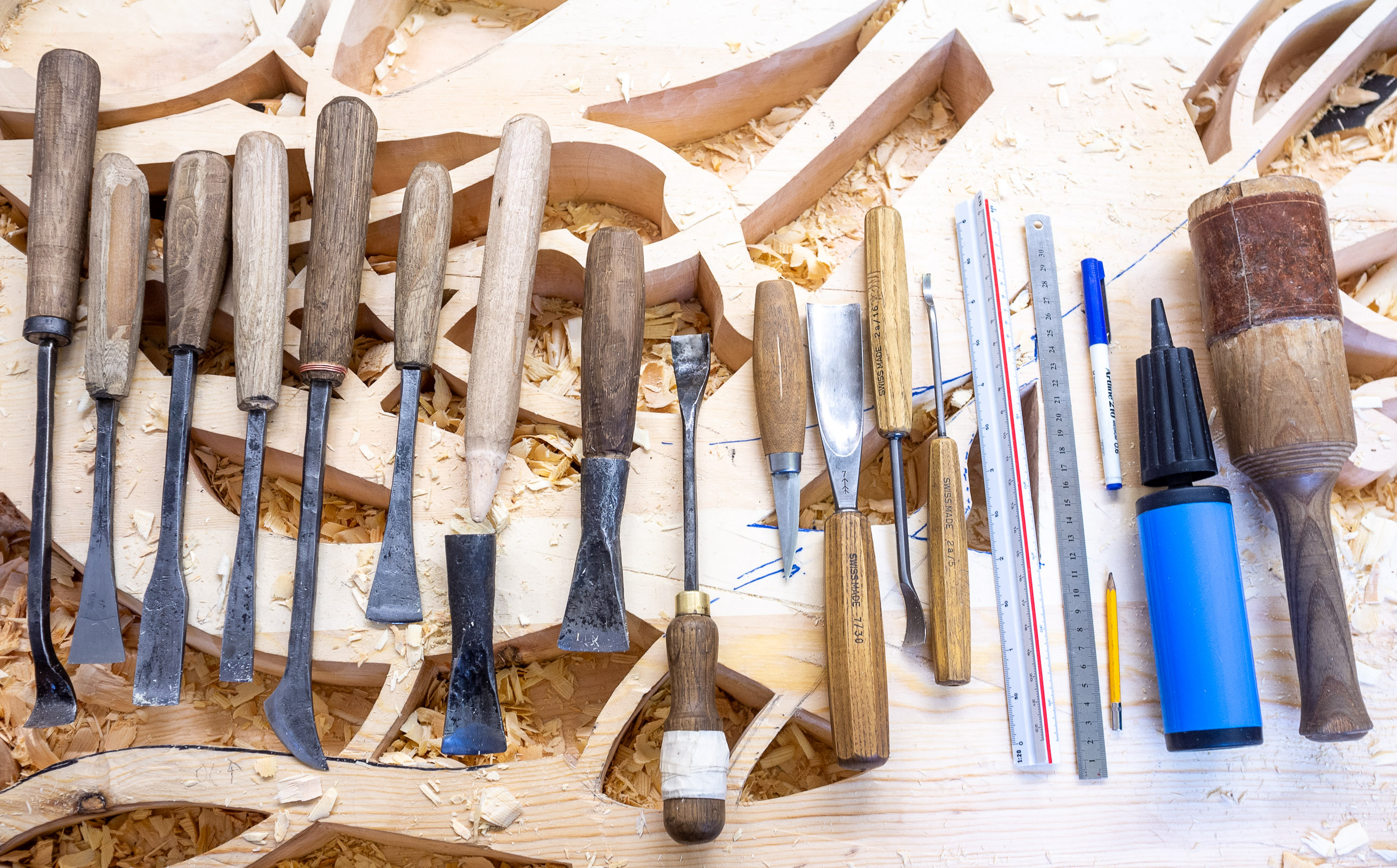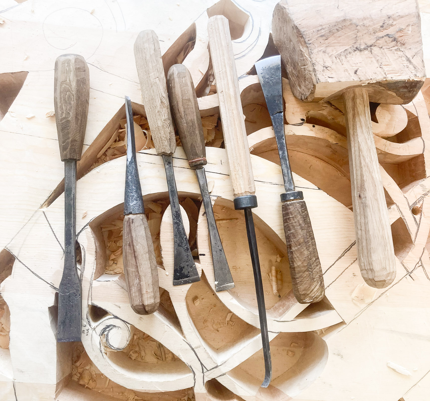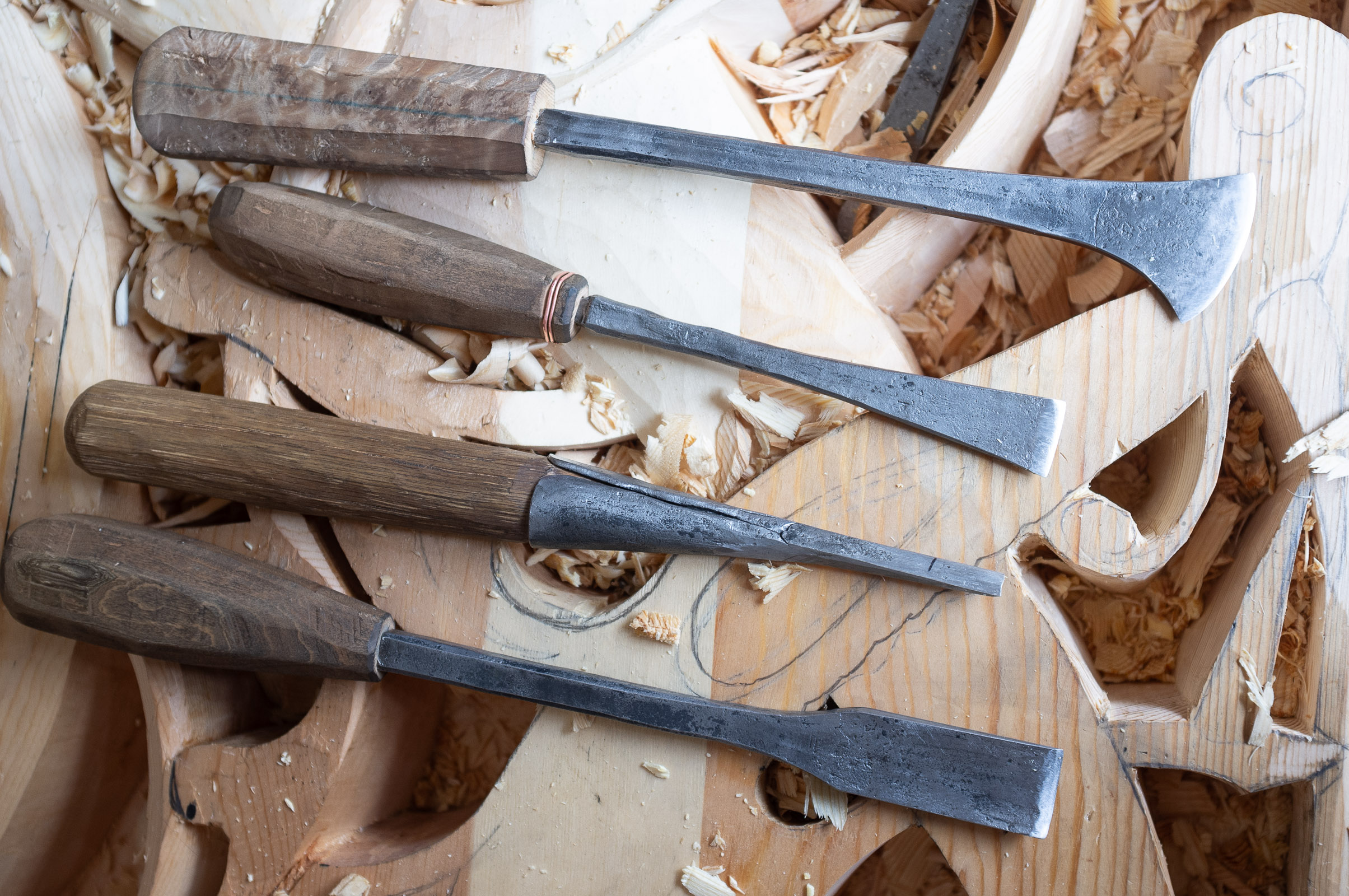 Til slutt, etter alle disse timene med skjæring, akkumulert refleksjon og opparbeida magefølelse har jeg forsøkt å plukke ut det settet jeg selv ville hatt med videre om jeg skulle skåret dette på nytt. Verdt å merke at det tross alt er ett bunnjern i settet, og at den nedslipte tollekniven er med i utvalget selv om jeg selv har vært tvilende til å regne inn den. En kan godt skjære en Urnesportal med et helt anna utvalg, men dette var det som føltes rett for meg.