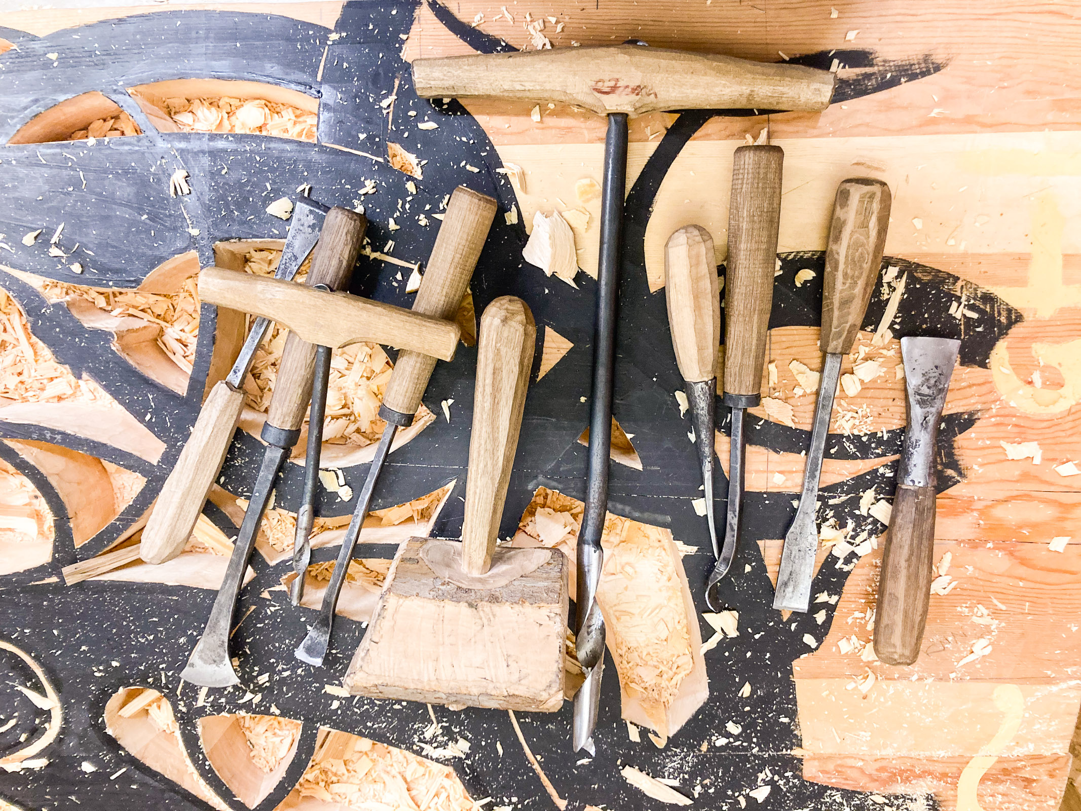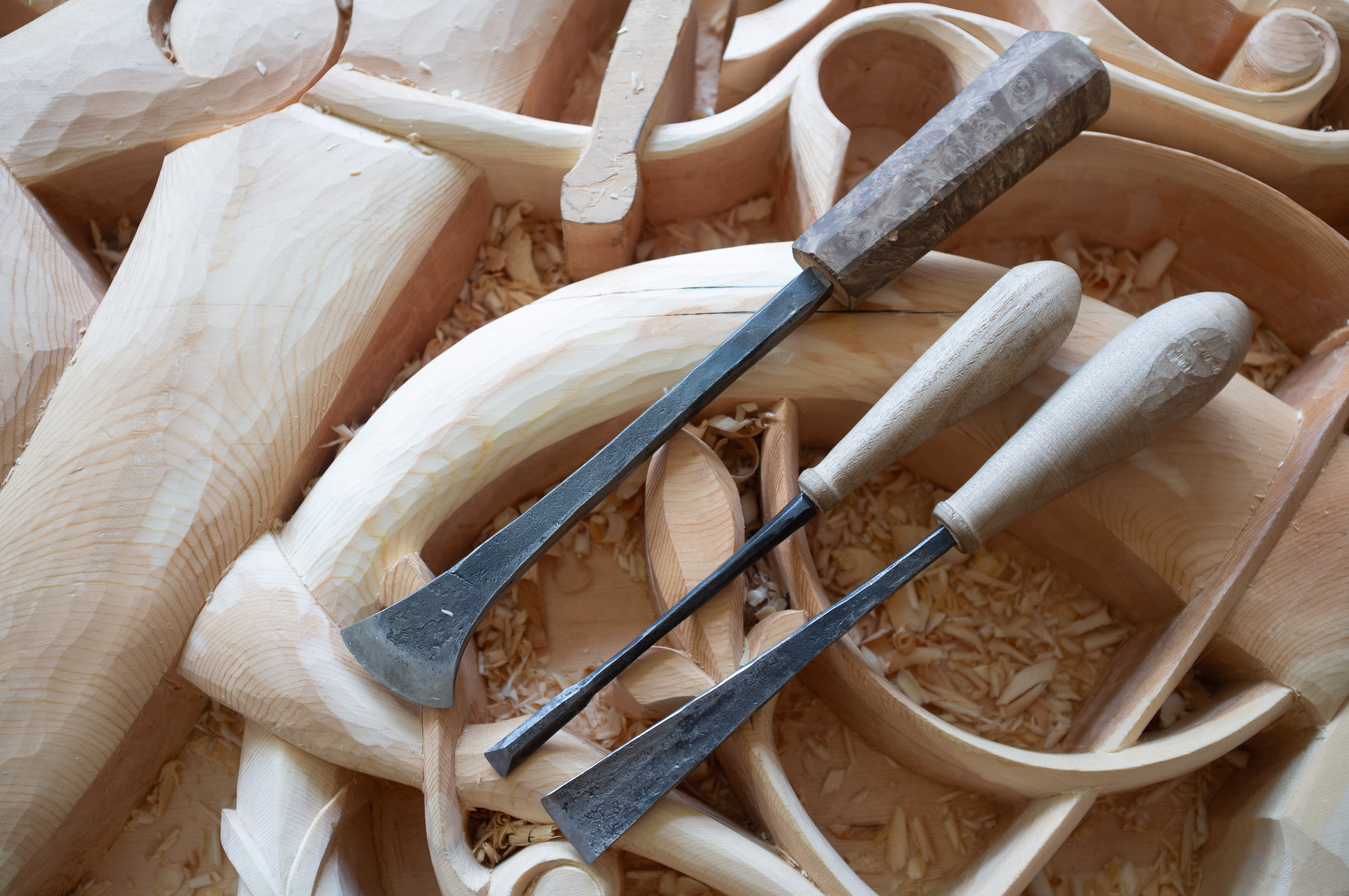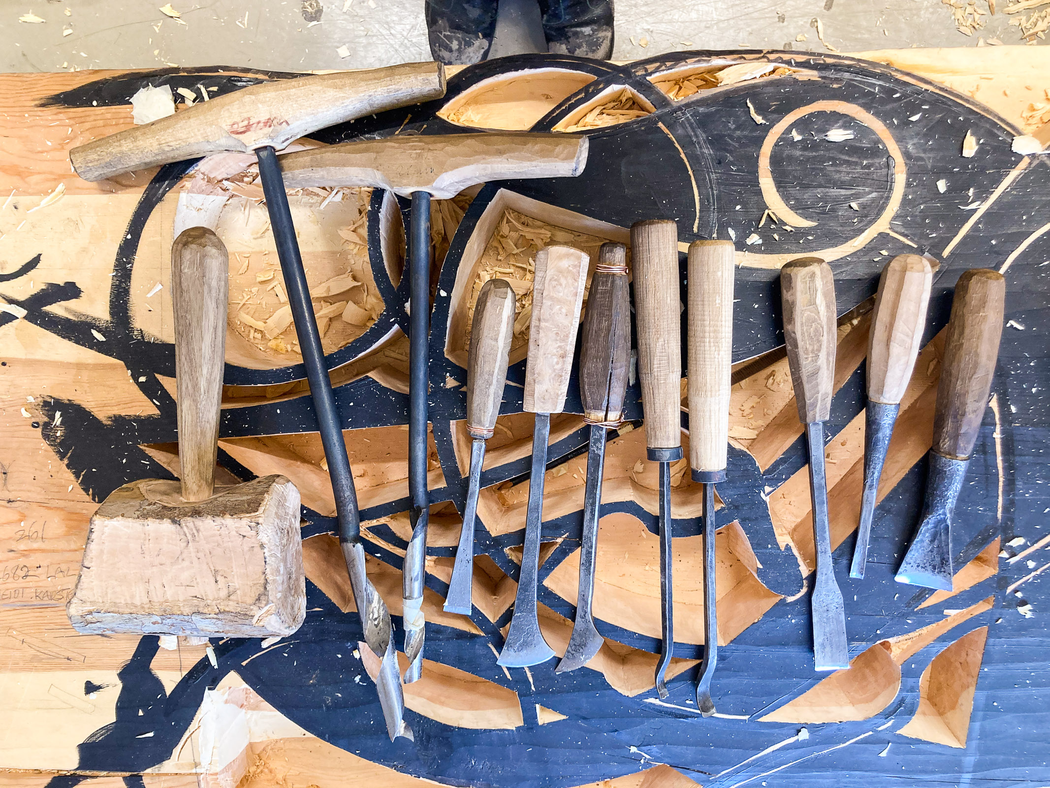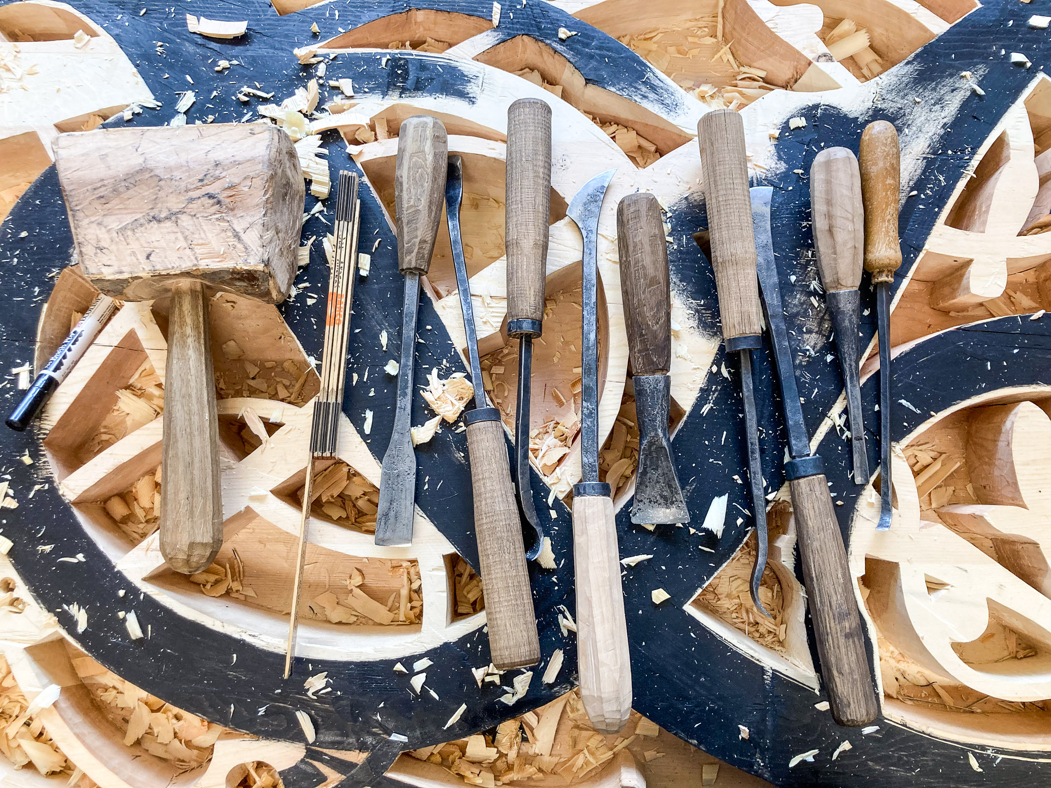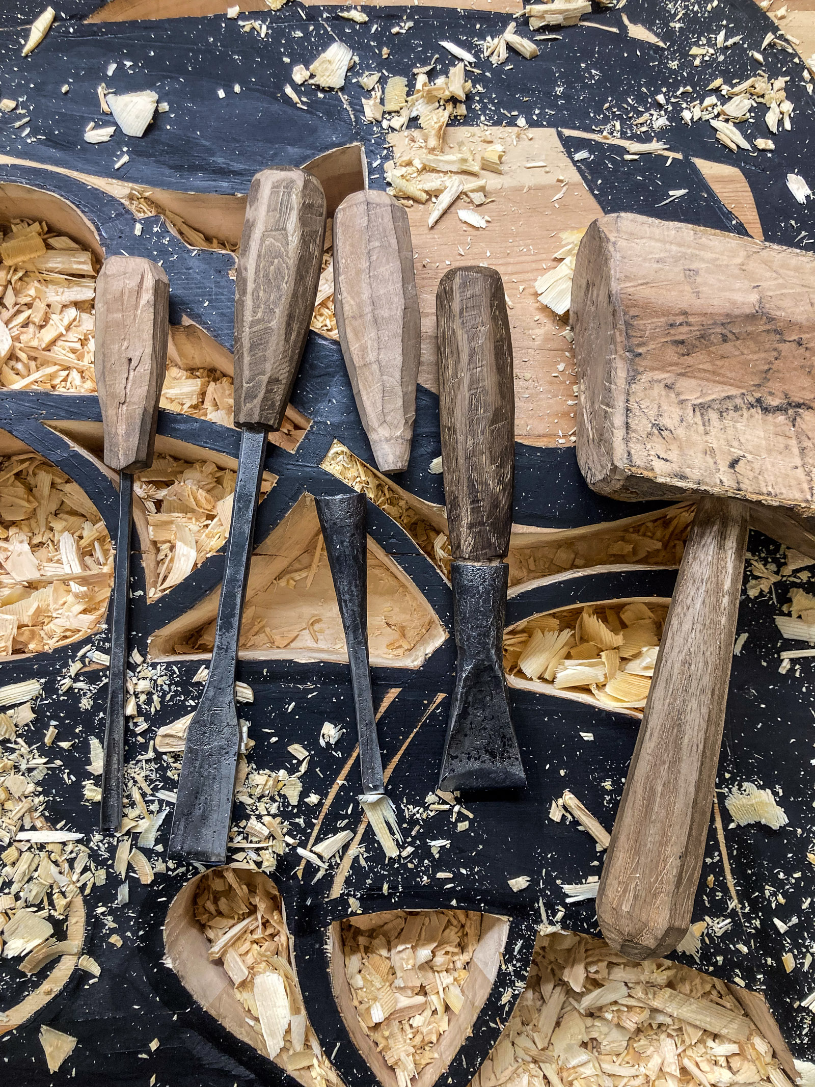 Til slutt, etter alle disse timene med skjæring, akkumulert refleksjon og opparbeida magefølelse har jeg forsøkt å plukke ut det settet jeg selv ville hatt med videre om jeg skulle skåret dette på nytt. Verdt å merke at det tross alt er ett bunnjern i settet, og at den nedslipte tollekniven er med i utvalget selv om jeg selv har vært tvilende til å regne inn den. En kan godt skjære en Urnesportal med et helt anna utvalg, men dette var det som føltes rett for meg.