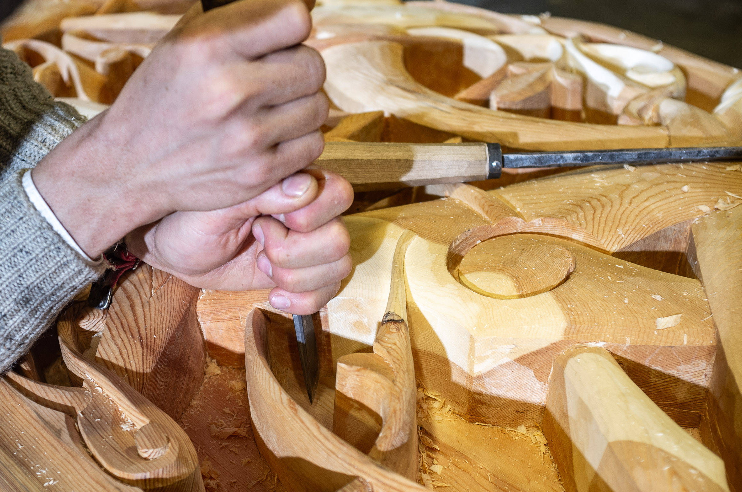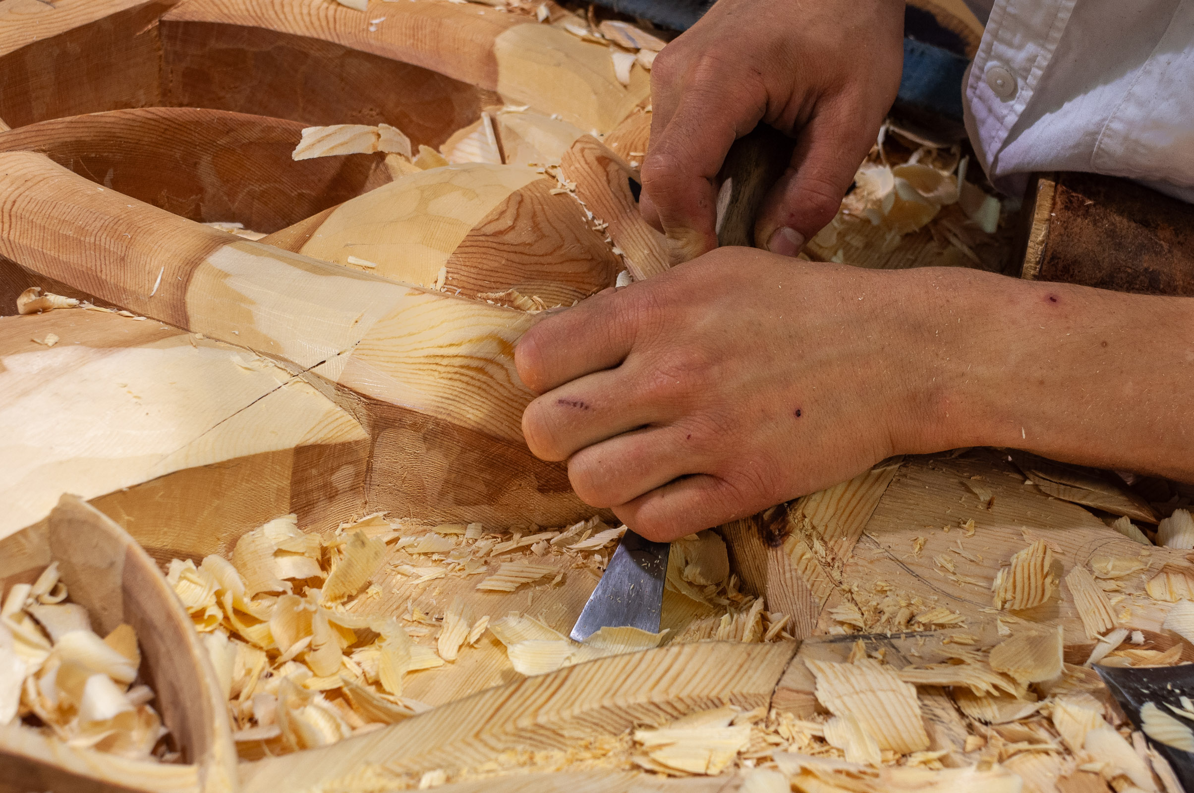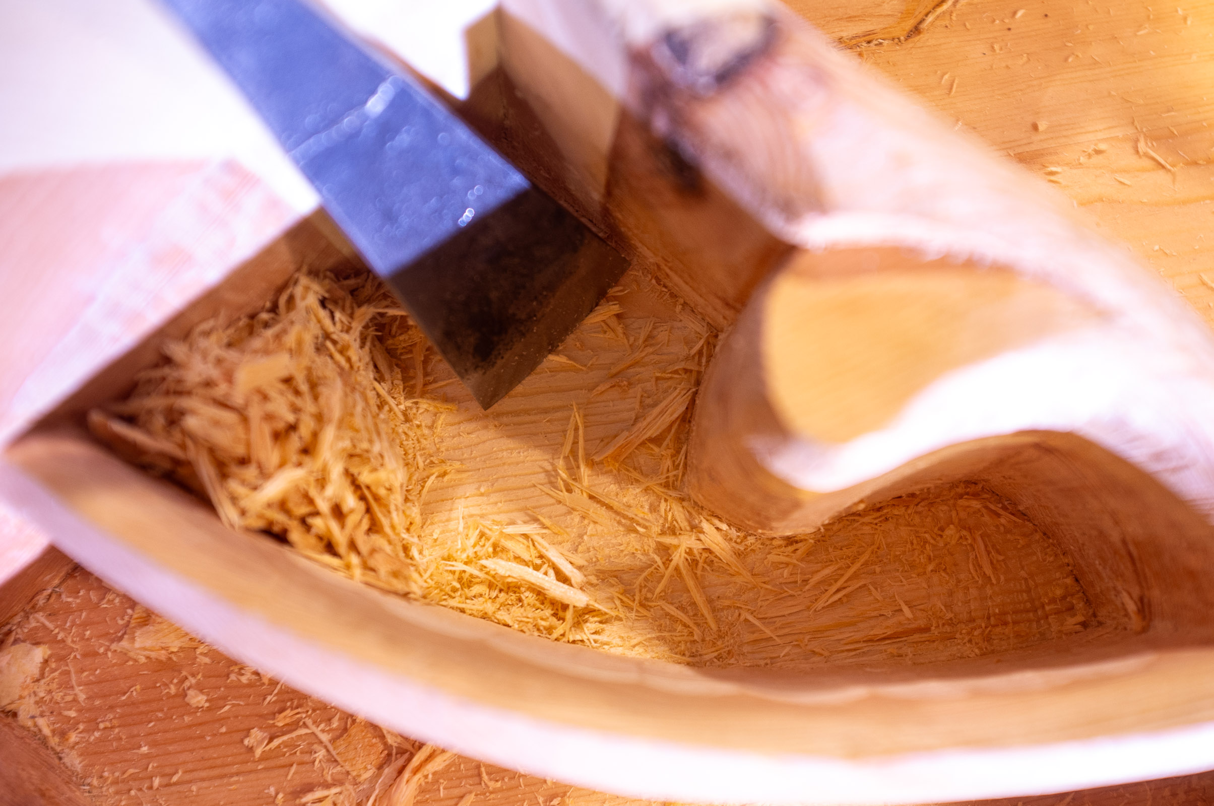 Teknikken er ganske selvinnlysende - et rett jern hugges først ned skrått mot ytterkantene av bunnen, og så skjæres flata mellom forsiktig ned. Det overraskende er hvor dype åpninger som kan skjæres slik, og enda dypere om jernet slipes brattere.