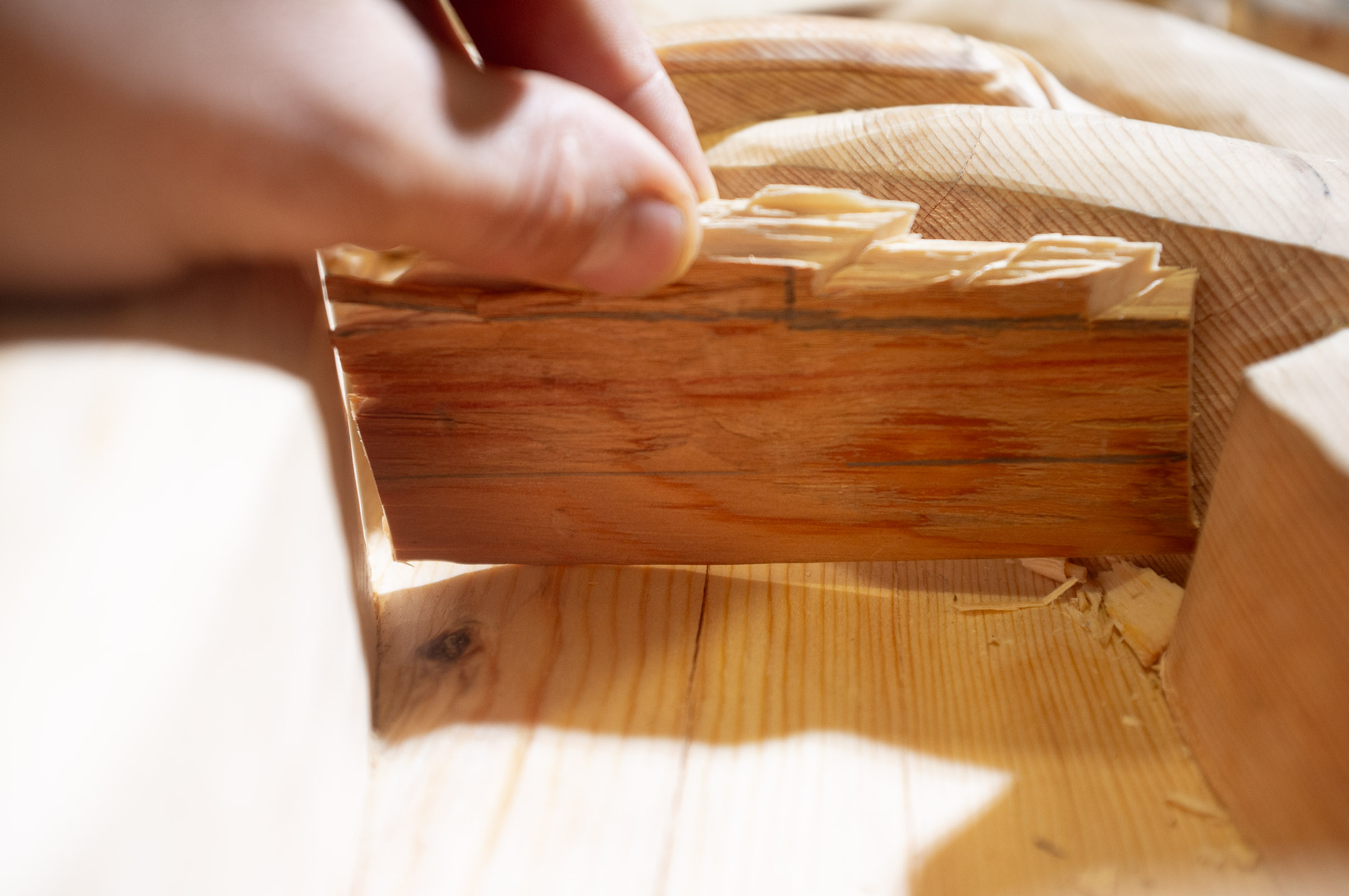 Skraping av bunn. Dette burde nok vært testa tidlig og testa grundig. Å (grov)forme bunner i nogenlunde ferskt virke er noe helt anna enn å gjøre det i treverk som allerede er tørka i flere år. Noe kan en fortsatt vriste ut av disse plankene, men det er viktig å huske at testene ufravikelig blir preget av å komme seint i prosessen.